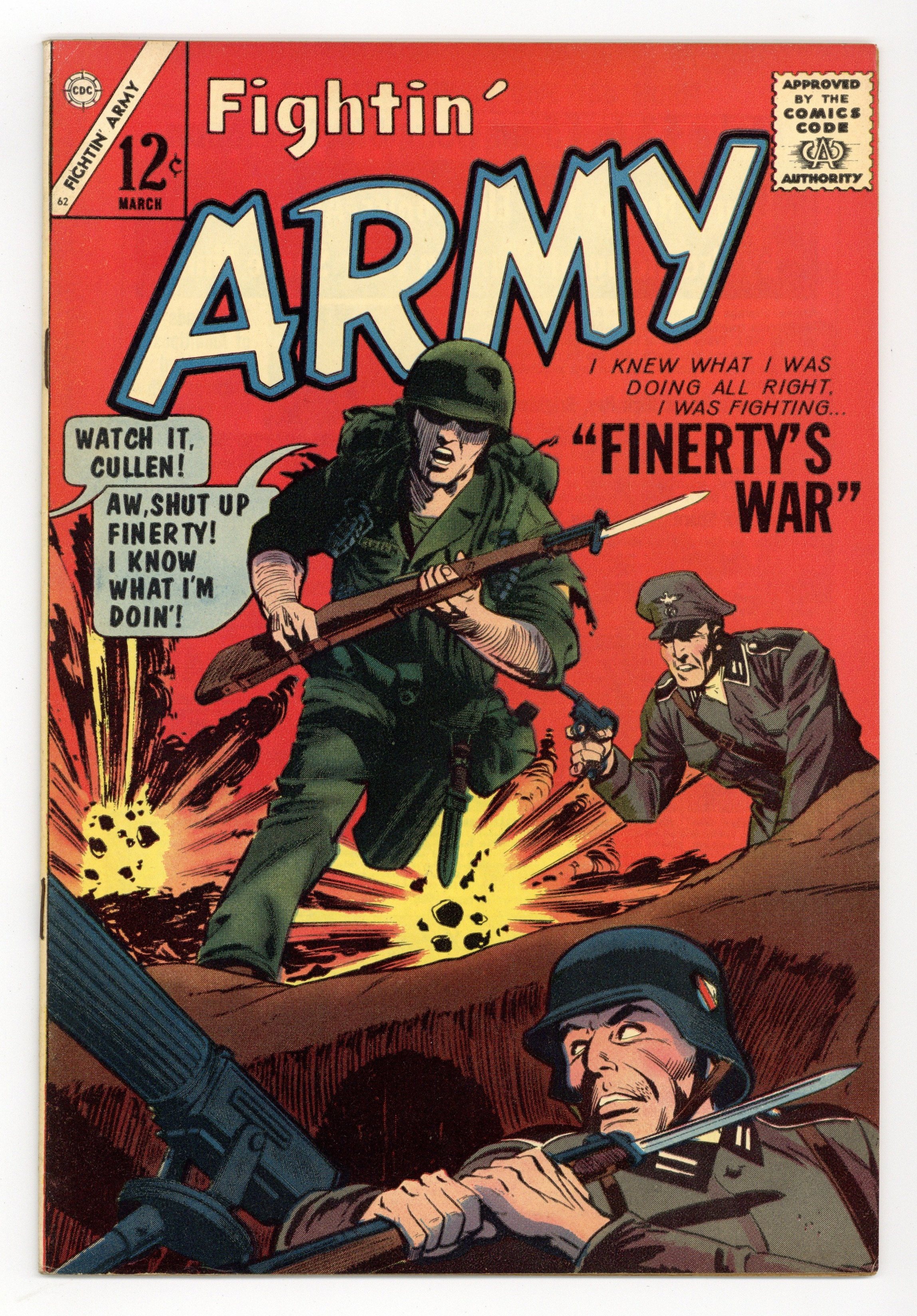 Cover by Dick Giordano. Stories and art by Bill Molno, Jon D'Agostino, Charles Nicholas and Vince Alascia. War comics featuring the US Army in WWII, Korea and other conflicts, part of Charlton's Fightin' military series. American troops make a stand against Rommel's impressive military tactics in North Africa. Two soldiers who hate each other must work together to survive a Nazi ambush. A slacker becomes the worst soldier ever. Death in the Desert; The Transition; Finerty's War; The Emperor's Champion; The Key Word; A.W.O.L. Willie; The Brave Ones. 32 pages, Full Color. Cover price $0.12.