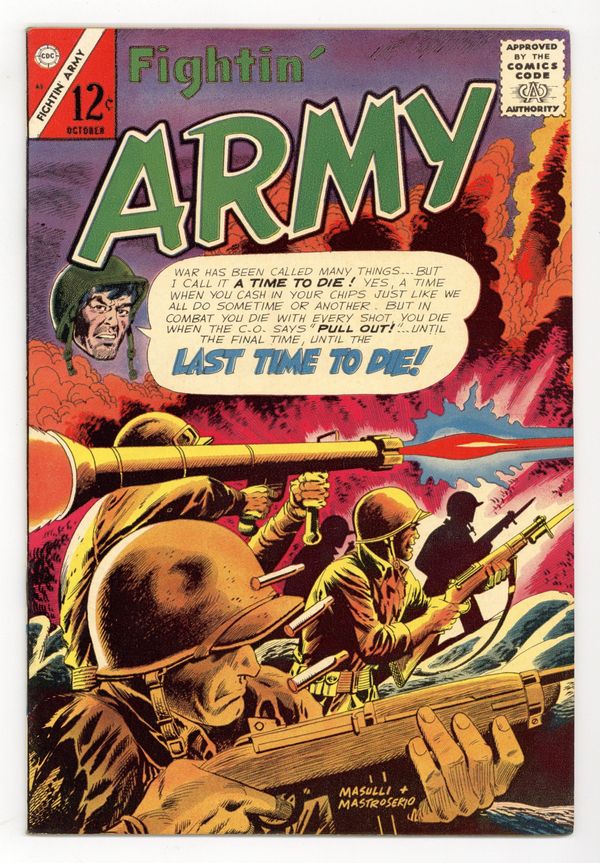 Cover by Pat Masulli and Rocco "Rocke" Mastroserio. Stories and art by Charles Nicholas and Vince Alascia. War comics featuring the US Army in WWII, Korea and other conflicts, part of Charlton's Fightin' military series. PFC Langan is just a kid according to his Sarge, but WWII turns him into a soldier. A GI realizes that a group of American soldiers are actually Nazis in disguise. New recruits face Axis forces in the jungles of New Guinea. Baby in the Squad; Tekiwawa's Sword; Last Time to Die; Face of a Friend; First Victory. 32 pages, Full Color. Cover price $0.12.