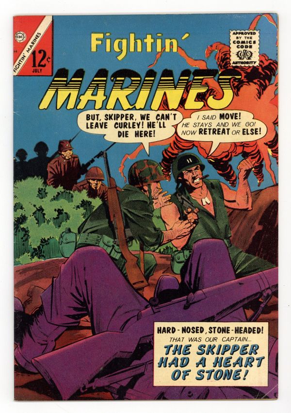 Cover by Dick Giordano. Stories and art by Charles Nicholas, Bill Montes, and Ernie Bache. Charlton's long-running series focused on the miliary exploits of the US Marines throughout the 20th century. Hayes has seen some tough Marine sergeants in his time, but Zeke is tougher than all of them, as he proves after an enemy attack. Baker Company is ordered to take an island during WWII, in a story that features a Marine taking down a fighter plane with a M-1 machinegun. A sergeant earns a reputation as the hardest hardcase in the war, with a heart of stone. Happy Birthday Hardnose; Capture That Castle; Desperation Hill; The Skipper Had a Heart of Stone. 32 pages, Full Color. Cover price $0.12.