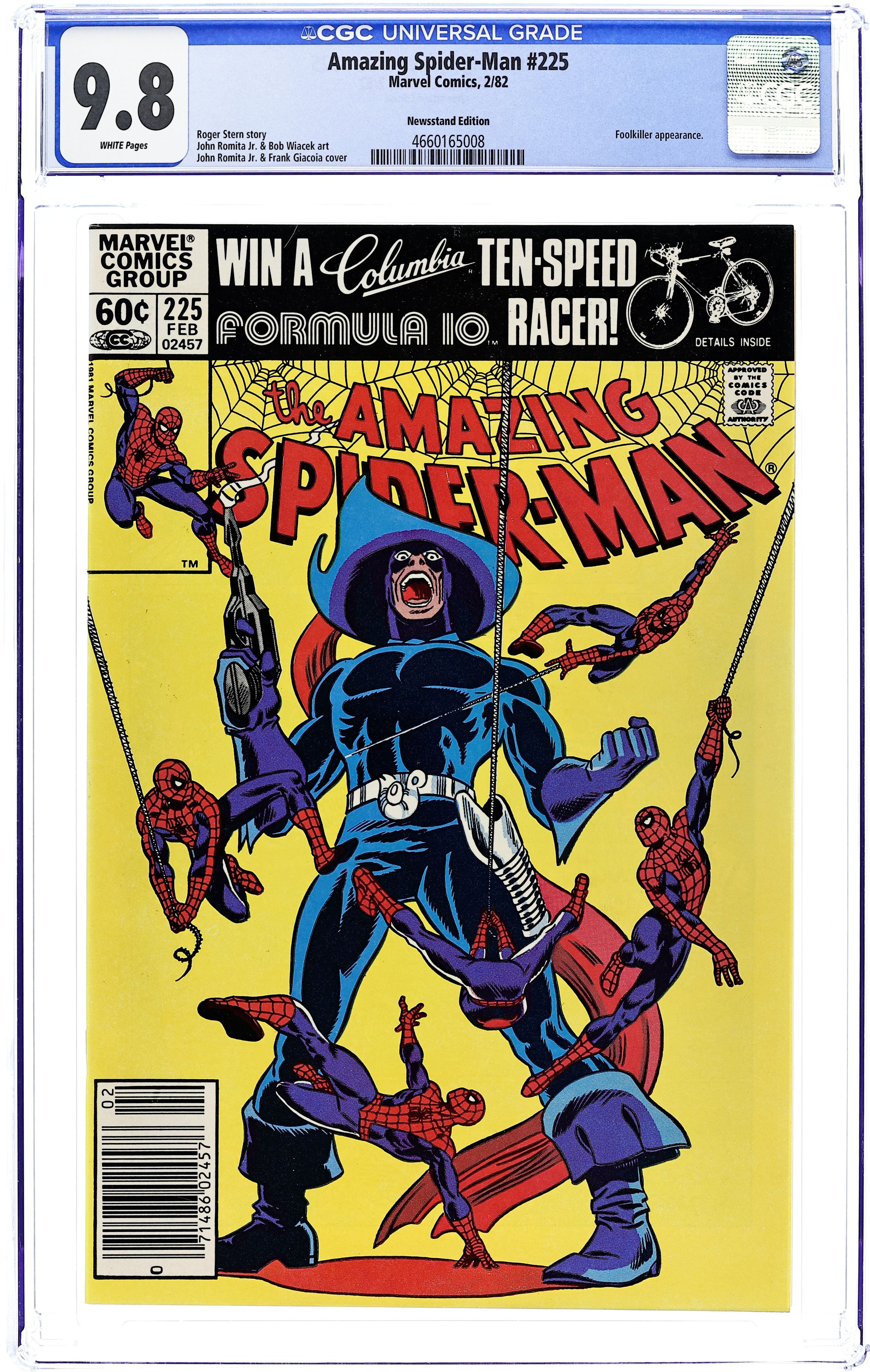 Newsstand Edition. "Fools...Like Us!" Script by Roger Stern. Pencils by John Romita Jr. Inks by Bob Wiacek. Cover by John Romita Jr. and Frank Giacoia. The man who does not suffer fools gladly...stalks Empire State University! And his first target is the Dean of Admissions! However a certain wall-crawling graduate student intercepts the Foolkiller at the Registrar's Office! After a brief struggle, the deranged vigilante escapes into the subway system! But the next afternoon he returns to campus to eliminate the foolish mailroom employees! In the nick of time though, the Spectacular Spider-Man swings into action; and the final duel with the Foolkiller is set! Fool me once, shame on you; fool me twice, shame on Spidey! A top-notch story! Cameo appearances by J. Jonah Jameson, Joe Robertson, and Debra Whitman. Flashback cameos by Hellcat and the Valkyrie to recap the Foolkiller's prior appearance in Defenders 74 & 75. (Notes: After appearing in Captain America 319, the Foolkiller returns in his self-titled Limited Series (1990). This issue includes a full-page ad for Dungeons & Dragons with art by Bill Willingham. The letters page previews the cover to next month's issue featuring the Black Cat. This story was reprinted in Spider-Man Magazine 1.) 36 pages. 50 cent cover price. Cover price $0.60.