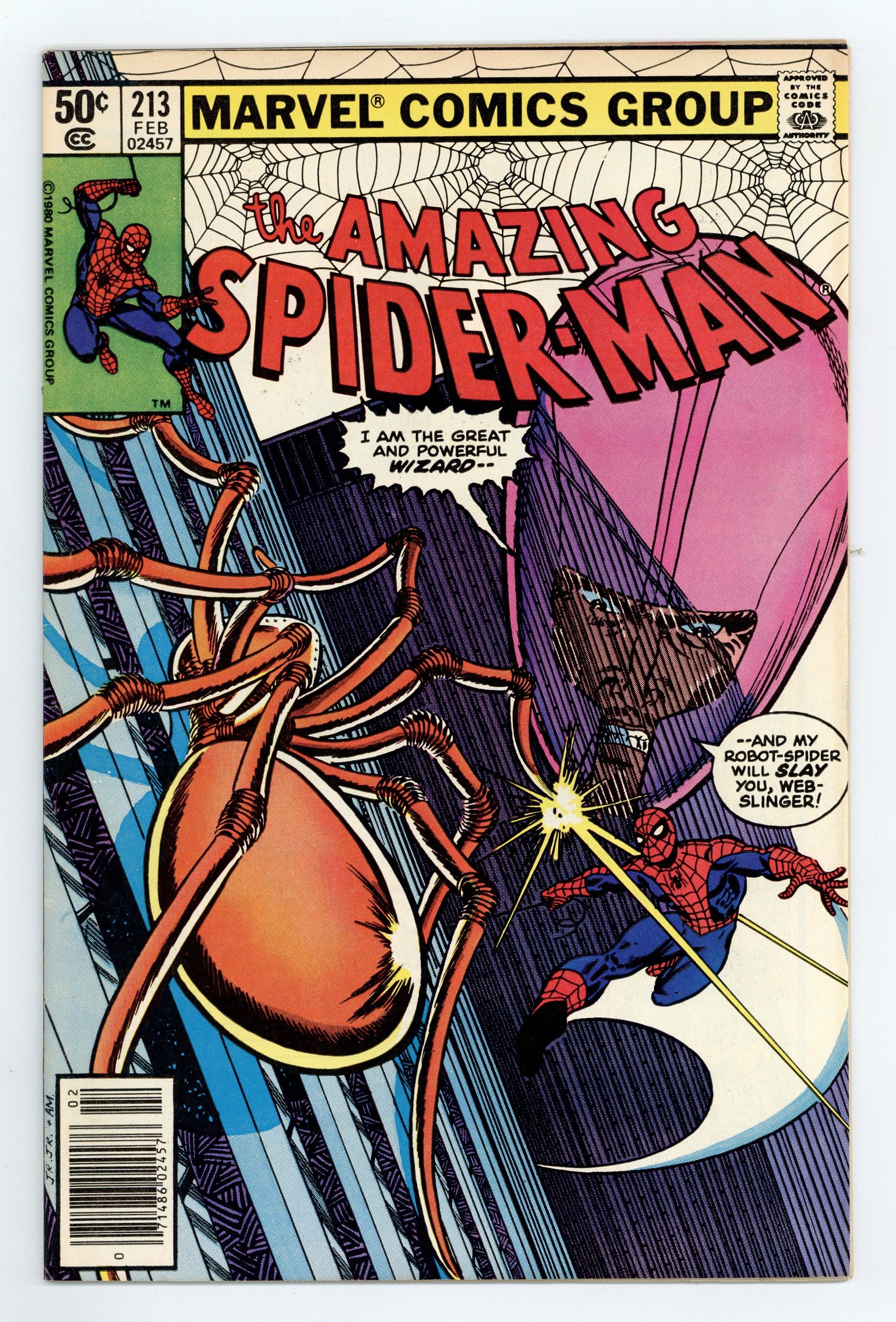 Newsstand Edition. "All They Want To Do Is Kill You, Spider-Man" Part 1 of 3. Script by Denny O'Neil. Art by John Romita Jr. (breakdowns) and Jim Mooney (finishes). Cover by John Romita Jr. and Al Milgrom. The forces of evil are gathering! And the plot begins with a prison break at Rykers Island! A mysterious villainess breaks the Wizard out of maximum security! Why? Because she wants deadly revenge against her hated enemy and Spider-Man too! The Wingless Wizard kicks off the attack by dispatching a spider robot to the World Trade Center to engage the web-slinger! After that doesn't work, he switches to plan B: set Peter Parker's apartment building on fire! Wow, this is getting very serious...and very personal! Cameo appearance by J. Jonah Jameson. (Notes: The Wizard previously appeared in Fantastic Four 218. This issue includes a full-page ad (with art by Frank Miller) for the Doctor Strange 2nd series. At one time Roger Stern and Frank Miller were going to team up on the title; however, another artist ended up penciling the series.) 36 pages. Cover price $0.50.