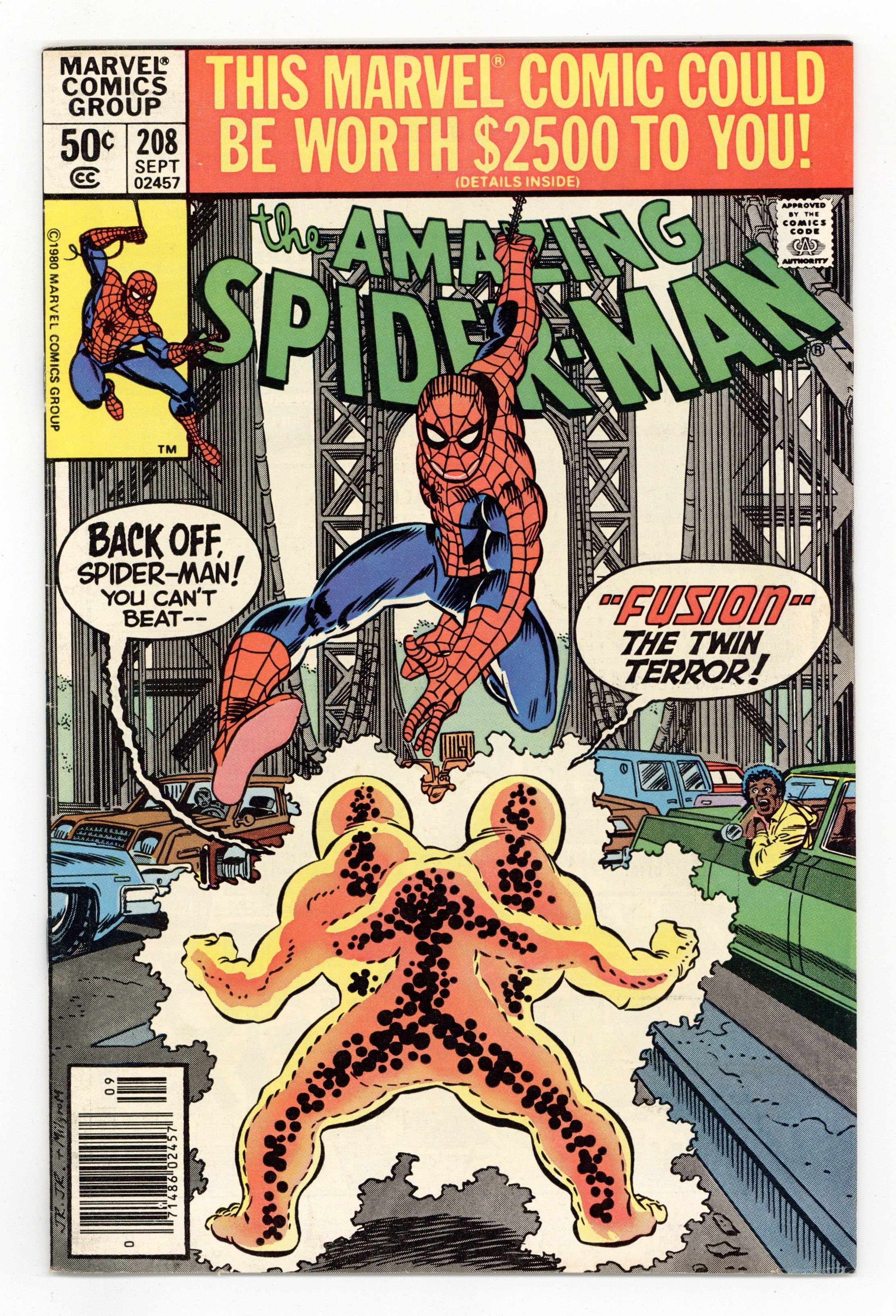 Newsstand Edition. "Fusion!" Plot by Jim Shooter and Mark Gruenwald. Script by Denny O'Neil. Art by John Romita Jr. (layouts), Al Milgrom (finishes), and Brett Breeding (finishes). Cover by John Romita Jr. and Al Milgrom. A freak atomic accident creates a new adversary for the Spectacular Spider-Man! Fusion...the twin terror! The little dynamo is wreaking havoc through New York City and charting a course for the Indian Point nuclear power plant across the Hudson! Now the wall-crawler did not study nuclear physics at Empire State University, but he does know that the key to stopping Fusion...is fission! Can your friendly neighborhood Spider-Man divide and conquer the glowing twin terror? First appearance of Lance Bannon. Cameo appearances by Aunt May and Anna Watson. First 50¢ issue. (Note: This issue features John Romita Jr.'s first artwork on the Amazing Spider-Man (1st) series.) 36 pages. Cover price $0.50.