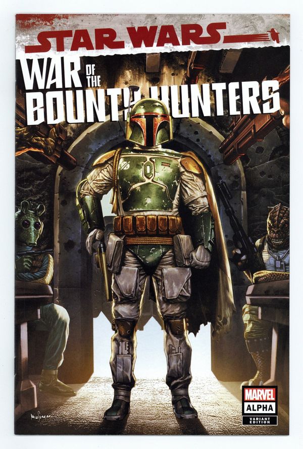 $12.00Comics Illuminati (Unknown Comics, Street Level Hero, and Comic Traders) Exclusive Cover by Mico Suayan. Written by Charles Soule. Art by Steve McNiven. THE STAR WARS COMIC EVENT YOU'VE BEEN WAITING FOR! The notorious bounty hunter BOBA FETT has finally landed his greatest prize - HAN SOLO, frozen in carbonite for easy transport. Fett will bring the smuggler to TATOOINE to collect the massive bounty placed on Solo's head by the fearsome crime lord JABBA THE HUTT. Sounds easy. What could go wrong? 28 pages, full color. Rated T Cover price $3.99.