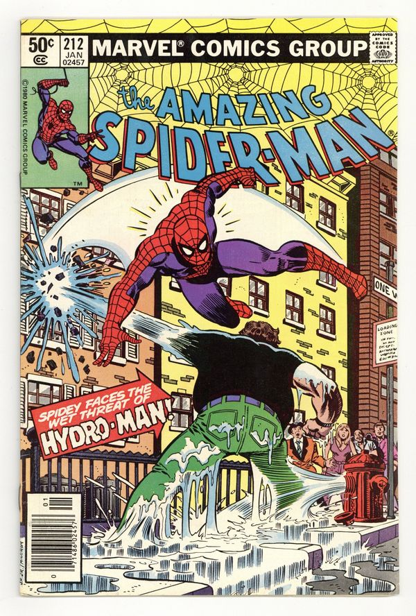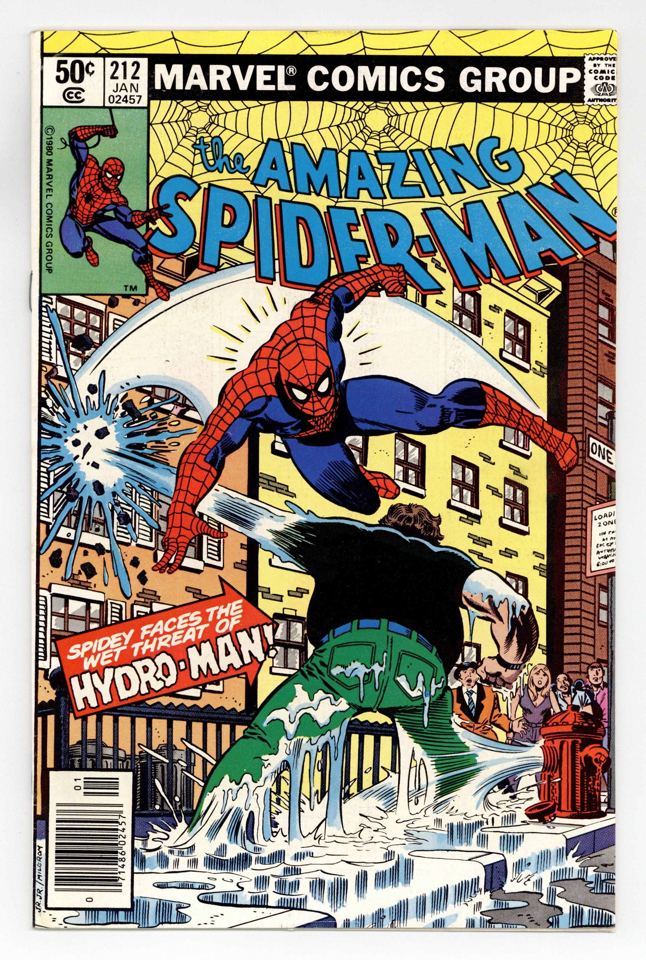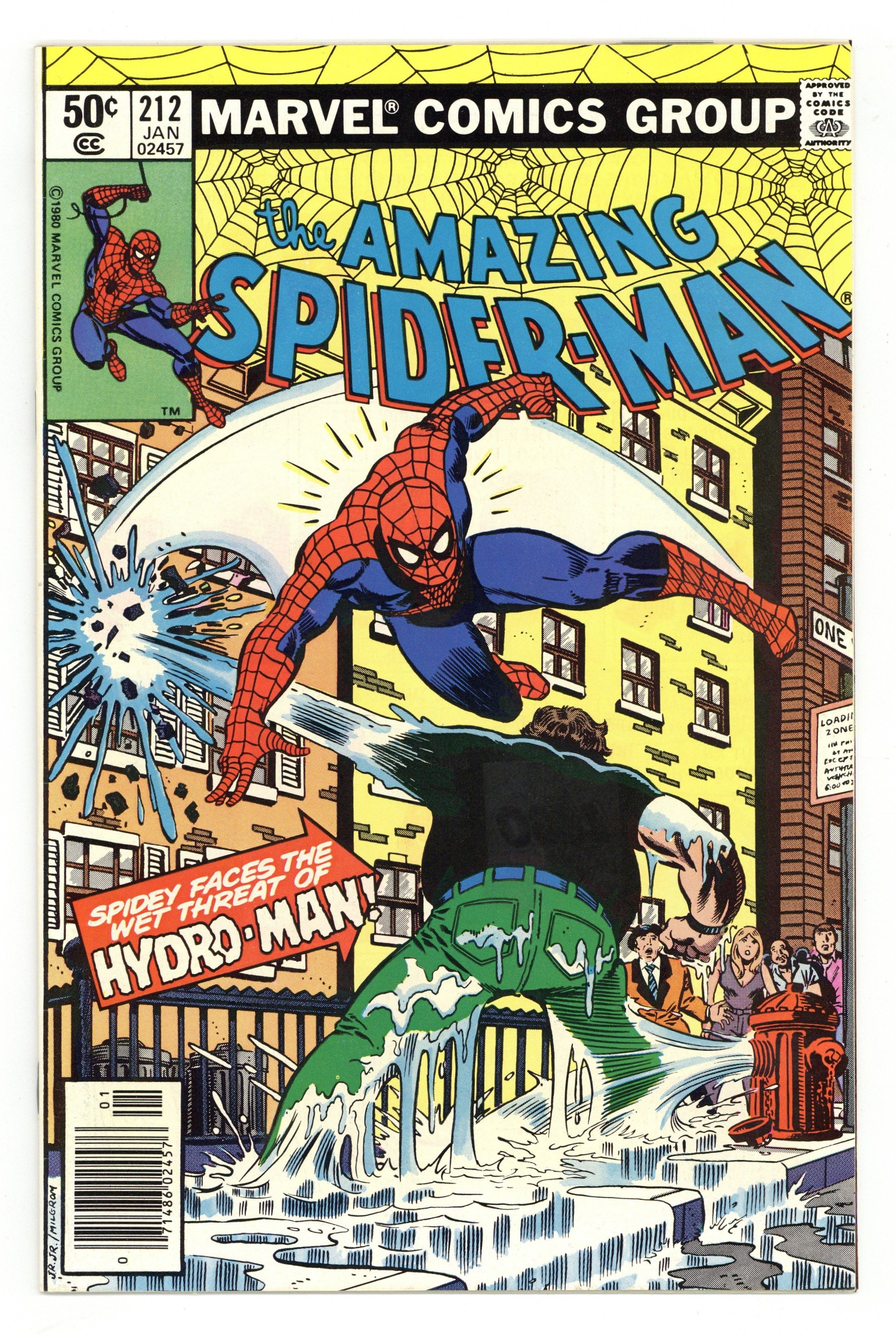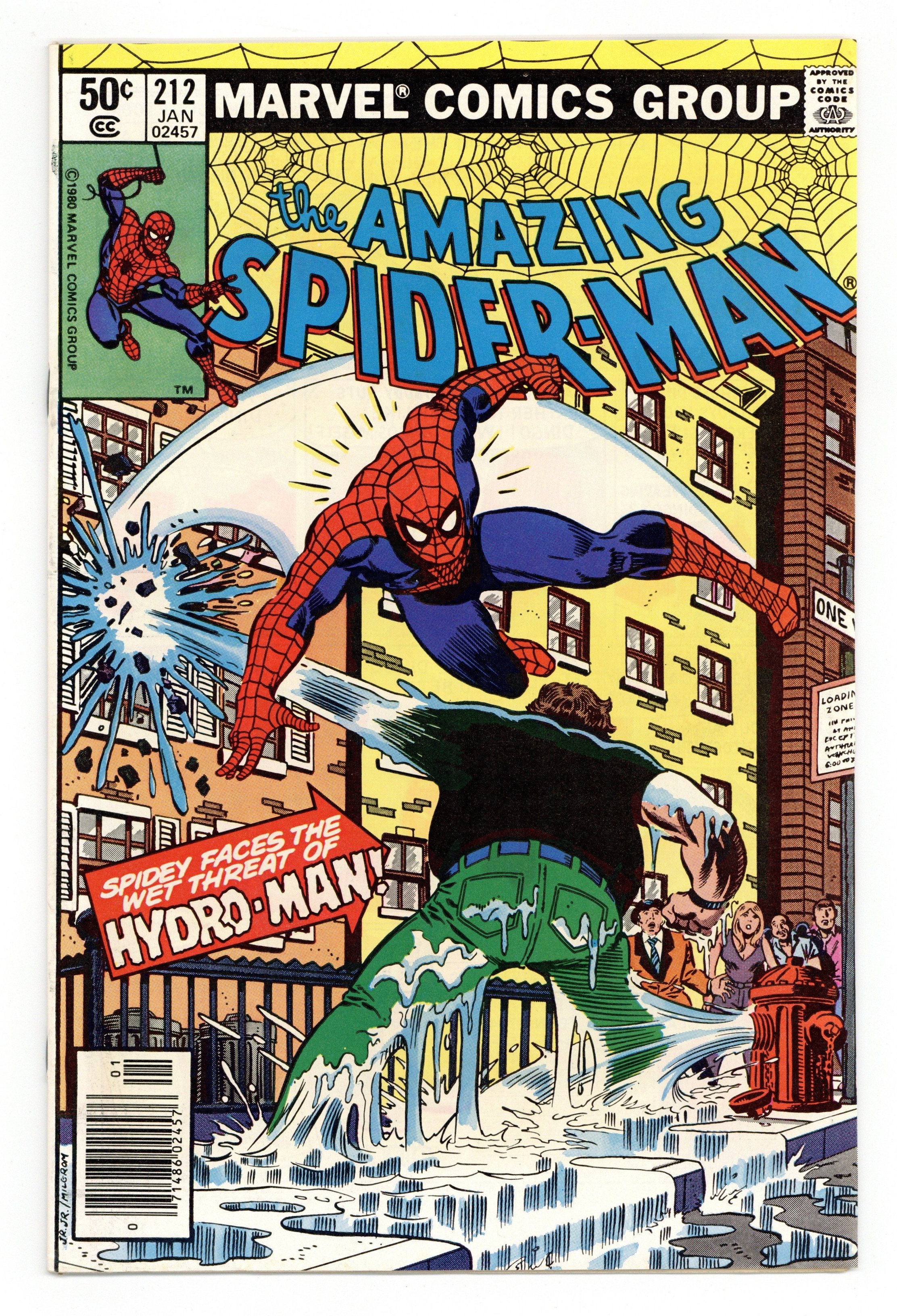 Newsstand Edition. "The Coming of Hydroman!" First appearance of Hydro-Man. Script by Denny O'Neil. Art by John Romita Jr. (breakdowns) and Jim Mooney (finishes). Cover by John Romita Jr. and Al Milgrom. The adventure with the Sub-Mariner is over! And now the cargo ship with the wall-crawling escort heads back into port. But before the vessel can dock, a bizarre accident sends a crewmember tumbling overboard near an experimental undersea generator! And instantly a new super-villain is born...Hydro-Man! Shortly thereafter Morrie Bench (aka Hydro-Man) starts settling scores with old enemies across the city! And Spider-Man is on his list! At high noon atop an NYC office building, Hydro-Man tries to drown the web-slinger! Does the amazing one need a life jacket? Cameo appearances by J. Jonah Jameson and Joe Robertson. (Notes: Hydro-Man returns in Amazing Spider-Man 217. This issue includes a full-page ad for Hostess Fruit Pies featuring Captain America and Nick Fury vs. the Trapster.) 36 pgs. Cover price $0.50.