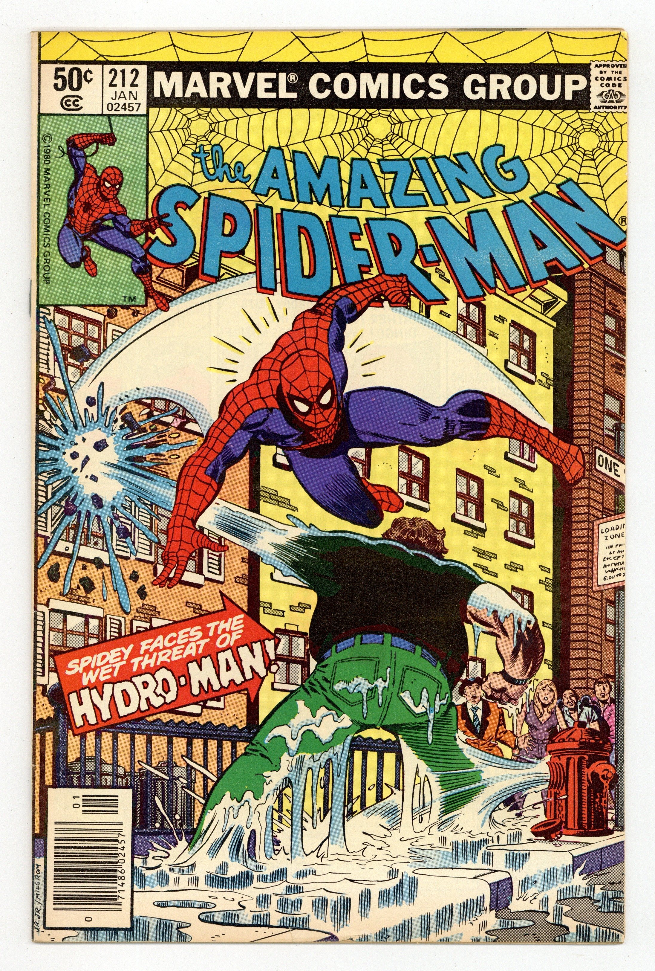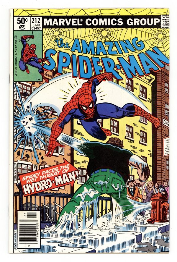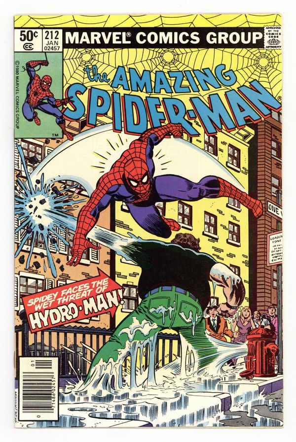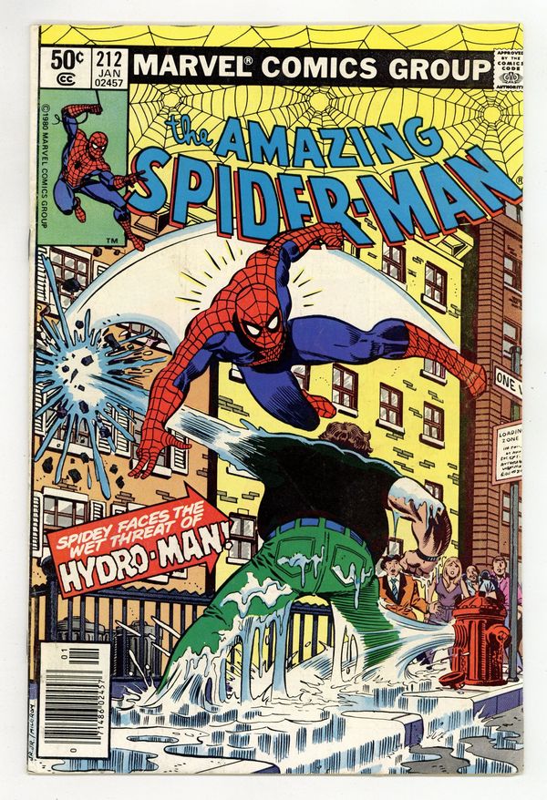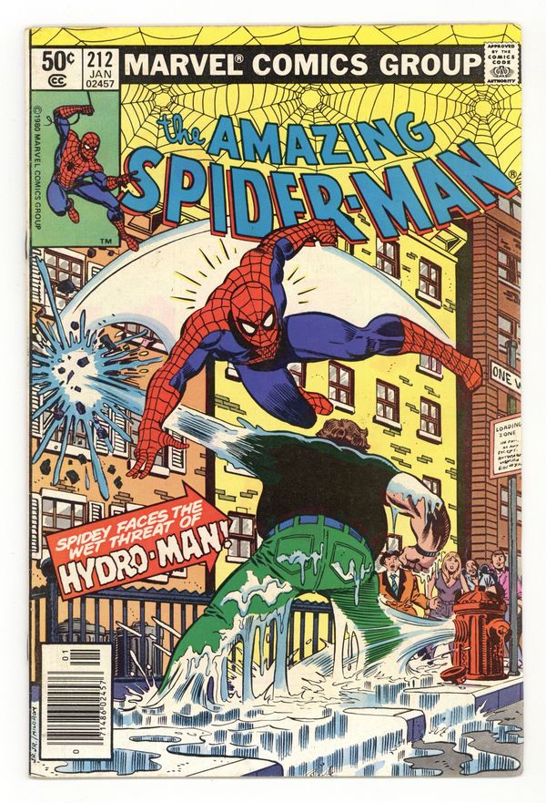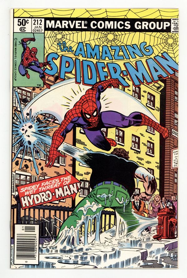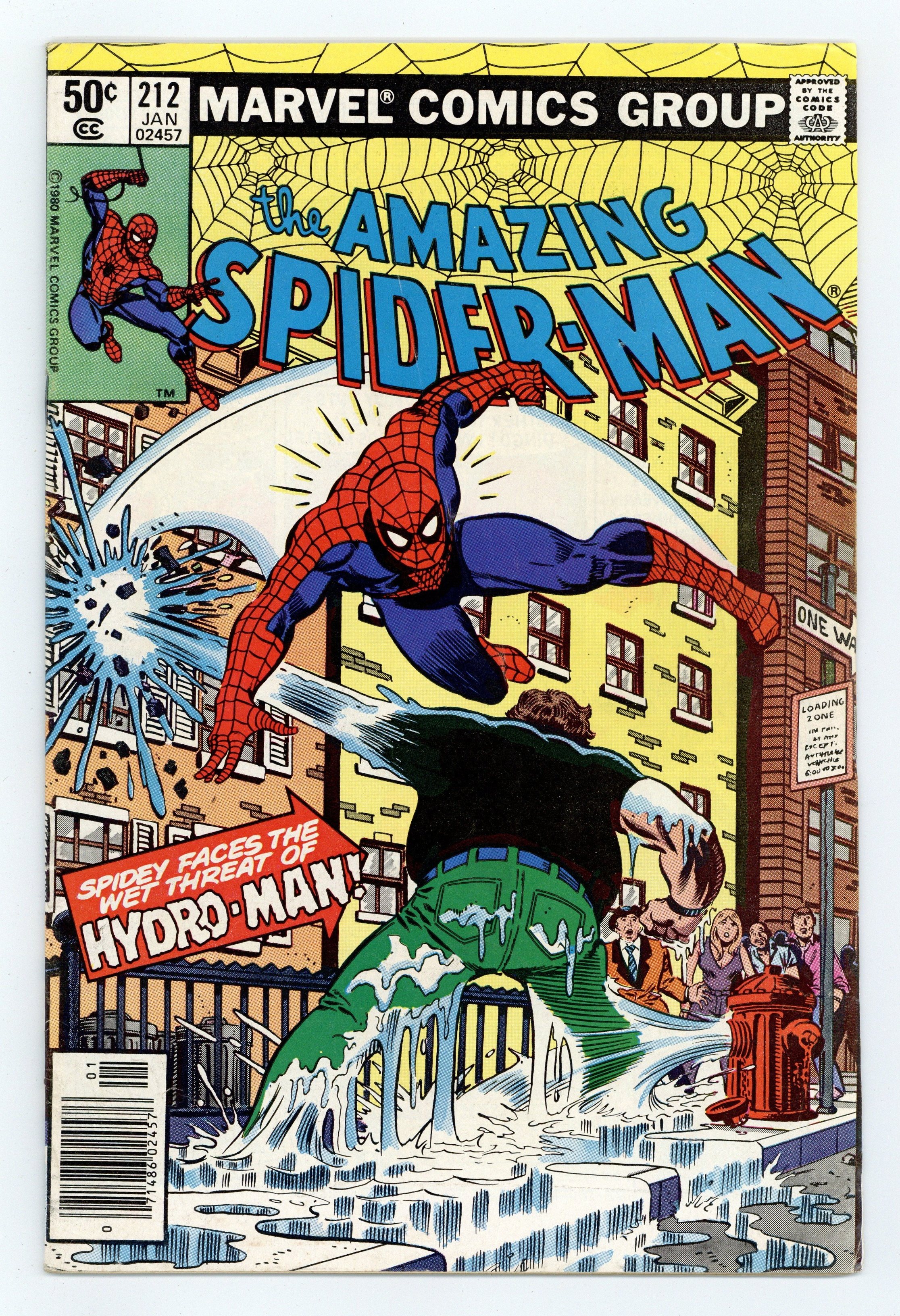 Newsstand Edition. "The Coming of Hydroman!" First appearance of Hydro-Man. Script by Denny O'Neil. Art by John Romita Jr. (breakdowns) and Jim Mooney (finishes). Cover by John Romita Jr. and Al Milgrom. The adventure with the Sub-Mariner is over! And now the cargo ship with the wall-crawling escort heads back into port. But before the vessel can dock, a bizarre accident sends a crewmember tumbling overboard near an experimental undersea generator! And instantly a new super-villain is born...Hydro-Man! Shortly thereafter Morrie Bench (aka Hydro-Man) starts settling scores with old enemies across the city! And Spider-Man is on his list! At high noon atop an NYC office building, Hydro-Man tries to drown the web-slinger! Does the amazing one need a life jacket? Cameo appearances by J. Jonah Jameson and Joe Robertson. (Notes: Hydro-Man returns in Amazing Spider-Man 217. This issue includes a full-page ad for Hostess Fruit Pies featuring Captain America and Nick Fury vs. the Trapster.) 36 pgs. Cover price $0.50.