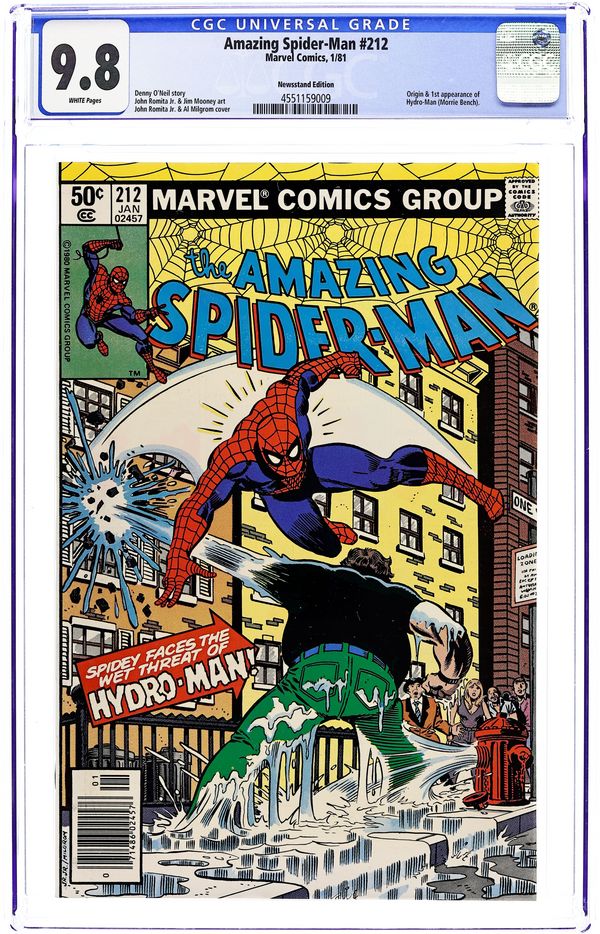 Ends Dec 8 7:20 PM CST Bid History 3 bids Current Bid $6 Your Secret Max Bid If you'd like to bid, please log in or register. Newsstand Edition. "The Coming of Hydroman!" First appearance of Hydro-Man. Script by Denny O'Neil. Art by John Romita Jr. (breakdowns) and Jim Mooney (finishes). Cover by John Romita Jr. and Al Milgrom. The adventure with the Sub-Mariner is over! And now the cargo ship with the wall-crawling escort heads back into port. But before the vessel can dock, a bizarre accident sends a crewmember tumbling overboard near an experimental undersea generator! And instantly a new super-villain is born...Hydro-Man! Shortly thereafter Morrie Bench (aka Hydro-Man) starts settling scores with old enemies across the city! And Spider-Man is on his list! At high noon atop an NYC office building, Hydro-Man tries to drown the web-slinger! Does the amazing one need a life jacket? Cameo appearances by J. Jonah Jameson and Joe Robertson. (Notes: Hydro-Man returns in Amazing Spider-Man 217. This issue includes a full-page ad for Hostess Fruit Pies featuring Captain America and Nick Fury vs. the Trapster.) 36 pgs. Cover price $0.50.
