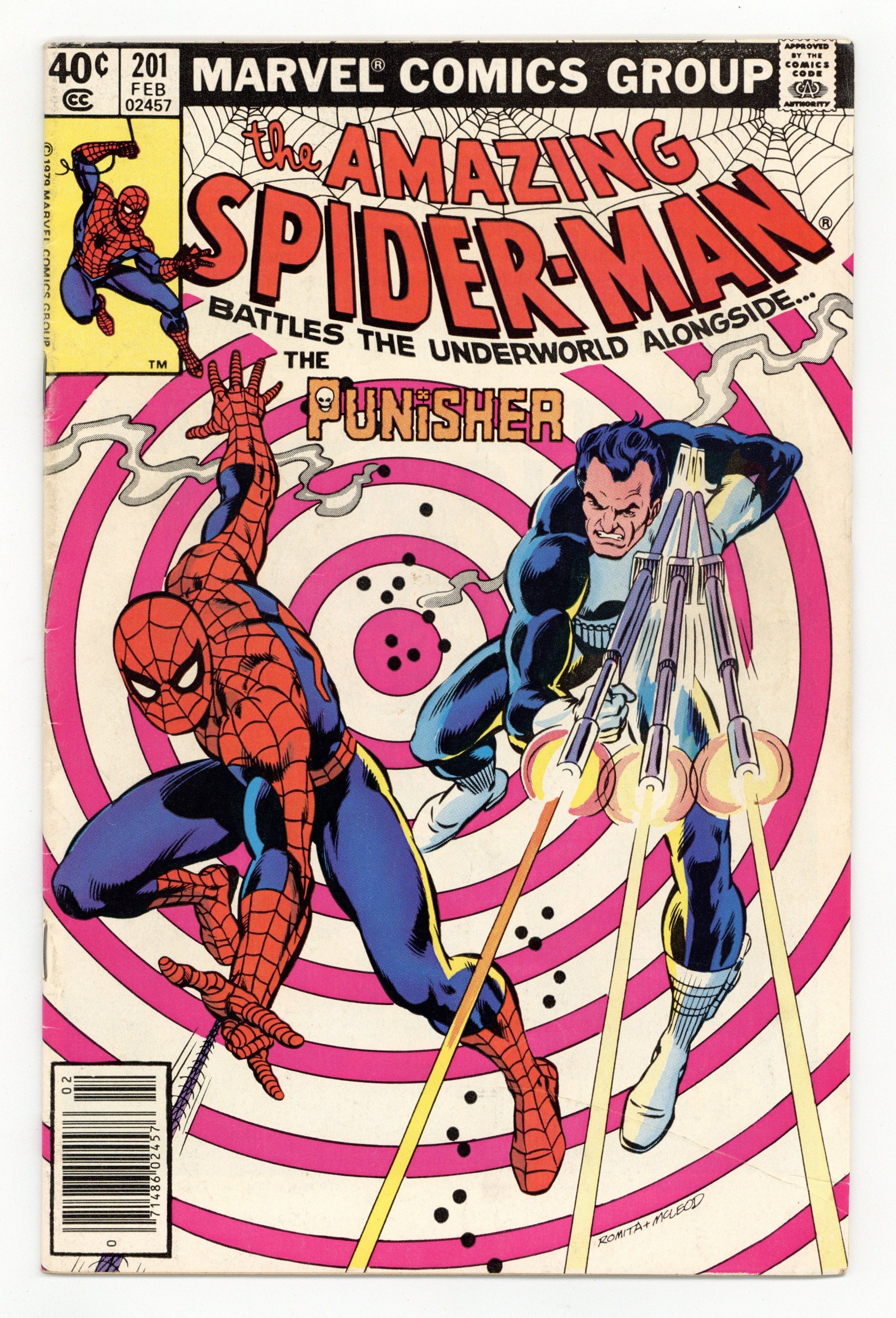 Starts Jan 19 Newsstand Edition. "Man-Hunt!" Part 1 of 2. Guest-starring the Punisher. Script by Marv Wolfman. Art by Keith Pollard (layouts) and Jim Mooney (finishes). Cover by John Romita and Bob McLeod. The action starts with a bang as the web-slinger catches a man falling out of a high-rise office building! When Spider-Man swings inside to investigate, he discovers the source of the problem: the Punisher! What has Frank Castle been up to since Spidey last saw him (in Amazing Spider-Man 175)? Oh, just business as usual...terrorizing the underworld! The following day to his surprise, the Punisher sees pictures of his penthouse gun battle in the Daily Globe! Credited to a photographer named Peter Parker! This troubles the Punisher! And that means trouble for Aunt May's nephew! War Journal Entry #519 is coming up next at a particular superhero's Chelsea apartment! Appearances by J. Jonah Jameson, Joe Robertson, Dr. Marla Madison, Aunt May, and Mary Jane Watson. (Notes: The Punisher previously appeared in Captain America 241. Mary Jane appears next in the classic Marvel Team-Up 79 where (as Red Sonja) she battles Kulan Gath alongside the web-slinger. This is one of Mary Jane's very few appearances between 1979 and 1983. She returns to the Amazing Spider-Man title in issue 238. This story was reprinted in Marvel Tales 218.) 36 pgs. Cover price $0.40.