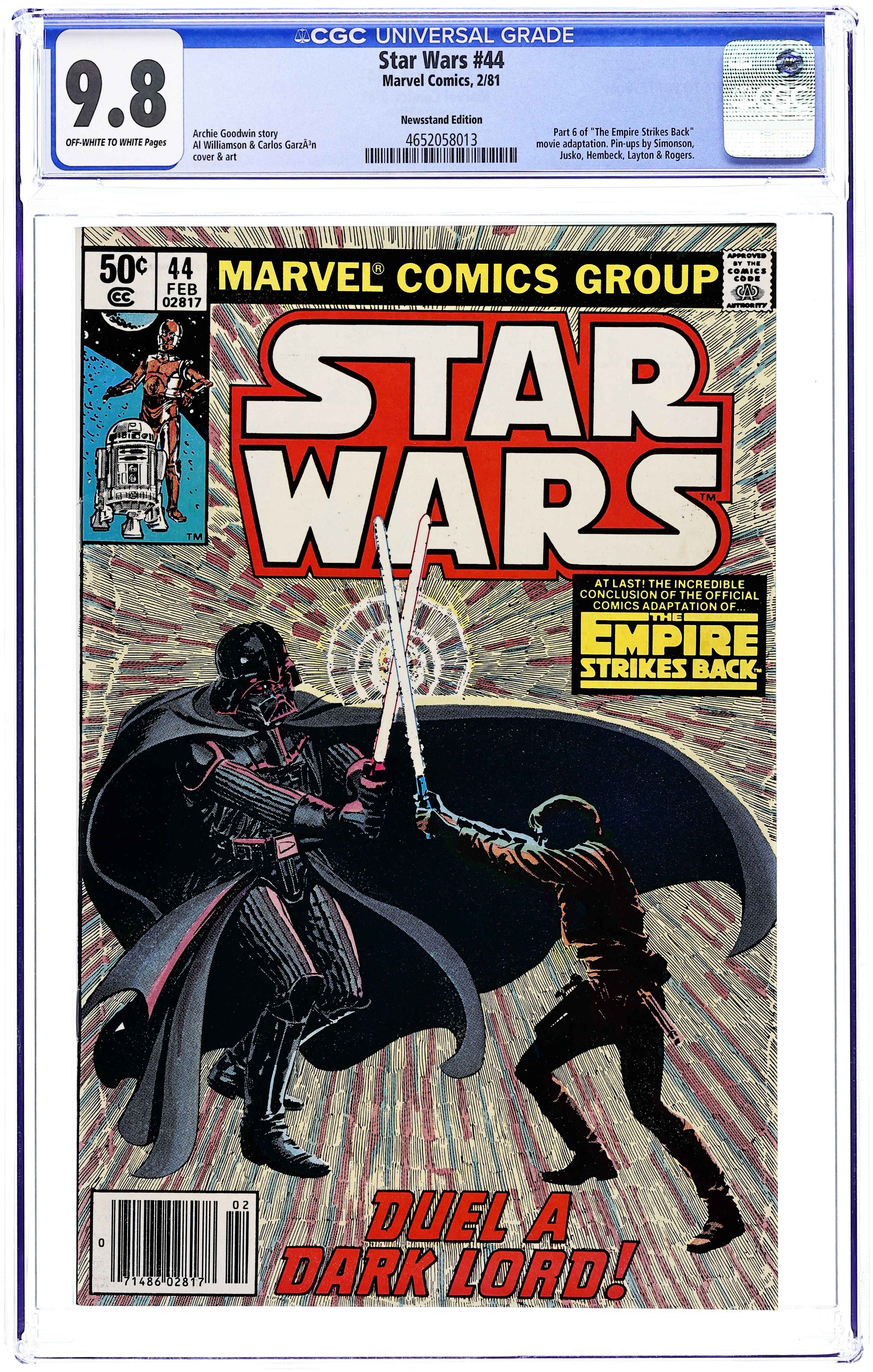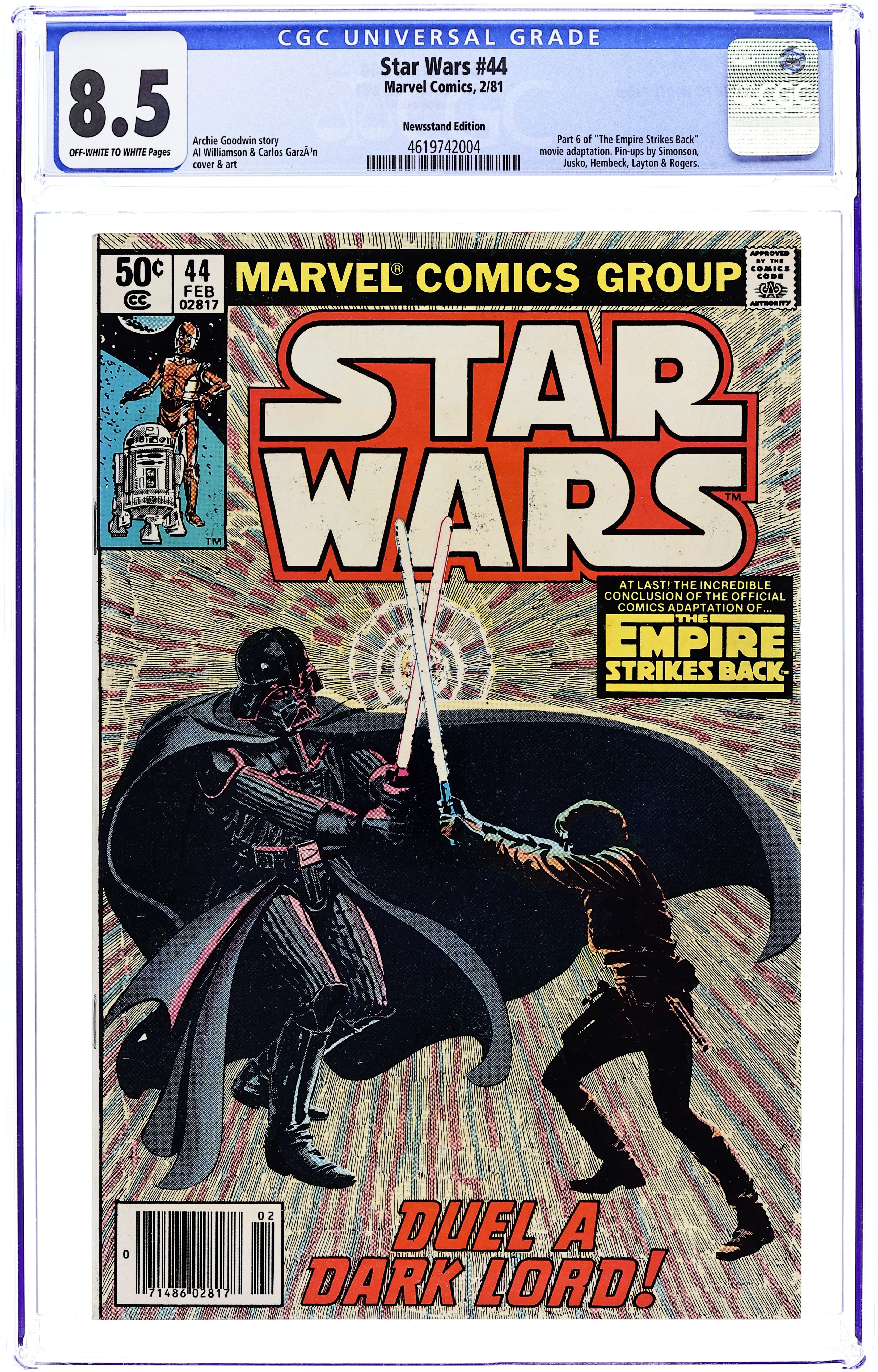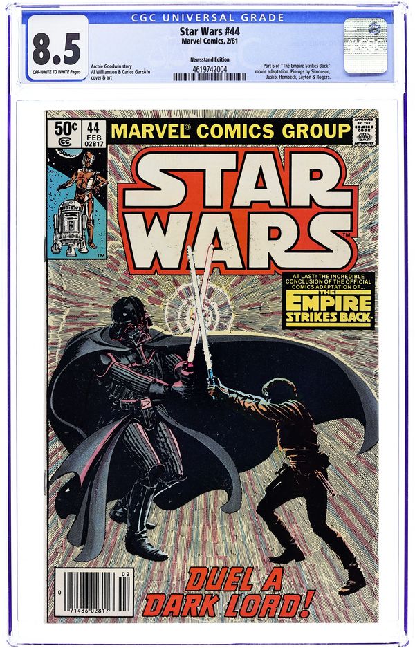 Ends Dec 8 9:28 PM CST Bid History 3 bids Current Bid $4 Your Secret Max Bid If you'd like to bid, please log in or register. Newsstand Edition. The Empire Strikes Back: Part 6 of 6. "Duel a Dark Lord!" Script by Archie Goodwin, art by Al Williamson and Carlos Garzon. Note: Part 6 of movie adaptation; based on the movie script; Williamson and Garzon both pencil and ink the art for this series. Plus: pin-ups by Walt Simonson, Joe Jusko, Fred Hembeck, Bob Layton and Marshall Rogers. Also: letters page commentary and farewell by Goodwin. Cover by Williamson and Garzon. Cover price $0.50.