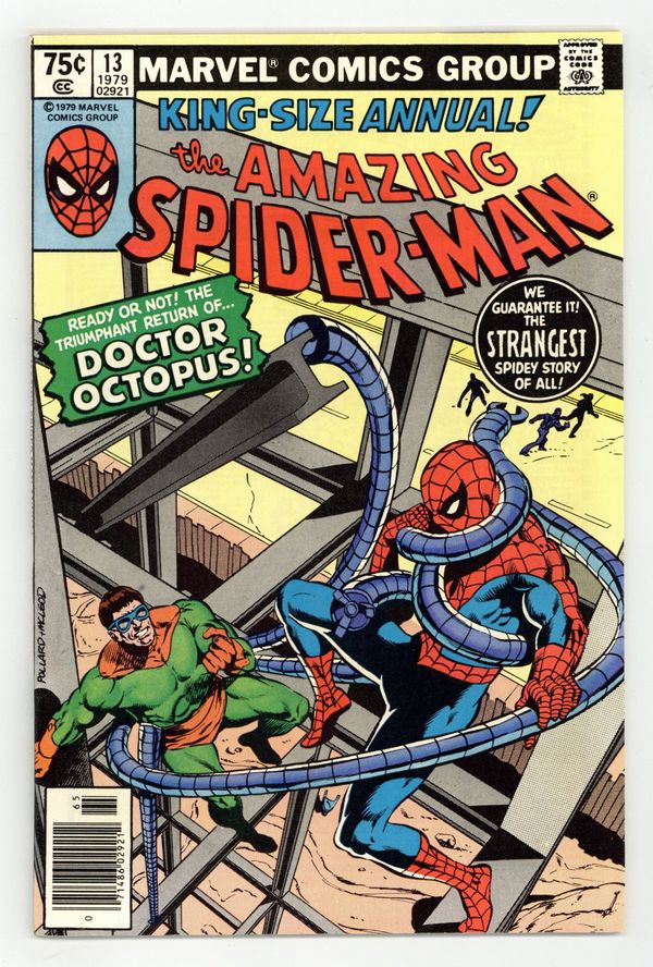 $12.00Newsstand Edition. "The Arms of Doctor Octopus" Part 1 of 2. Script by Marv Wolfman. Pencils by John Byrne. Inks by Terry Austin. (Brilliant art that rivals their work on the Uncanny X-Men series during the same time period). Cover by Keith Pollard and Bob McLeod. It's an off-beat tale as a (presumed dead) government agent helps the web-slinger track down his long-time foe: Doctor Octopus! The wall-crawler doesn't know exactly what Otto Octavius is planning, but he knows that the six-armed super-villain must be stopped! At a construction site in the Bowery, the Amazing Spider-Man and Doc Ock wage war again! And if Spidey has to rip off Dr. Octopus' arms to beat him...he will! Story continues in Spectacular Spider-Man Annual 1. Second feature: "A Gallery of Spider-Man's Most Famous Foes!" Script by Marv Wolfman. Art by Keith Pollard and Frank Giacoia. 8 pages of pin-ups featuring the Molten Man, Looter, Rhino, Shocker, Kingpin, Silvermane, Man-Mountain Marko, Prowler; and the Kangaroo. Third feature: "Peter Parker's Pad!" One-page illustration of Peter's Chelsea apartment and neighborhood. Fourth feature: One-page diagram of the offices of both the Daily Bugle and Daily Globe. Fifth feature: One-page layout of the campus of Empire State University. (Notes: Dr. Octopus previously appeared in Amazing Spider-Man 159. Government agent Kent Blake is assumed to be the same person featured in Atlas' (1951) golden age series: Kent Blake of the Secret Service.) 52 pages. Cover price $0.75.