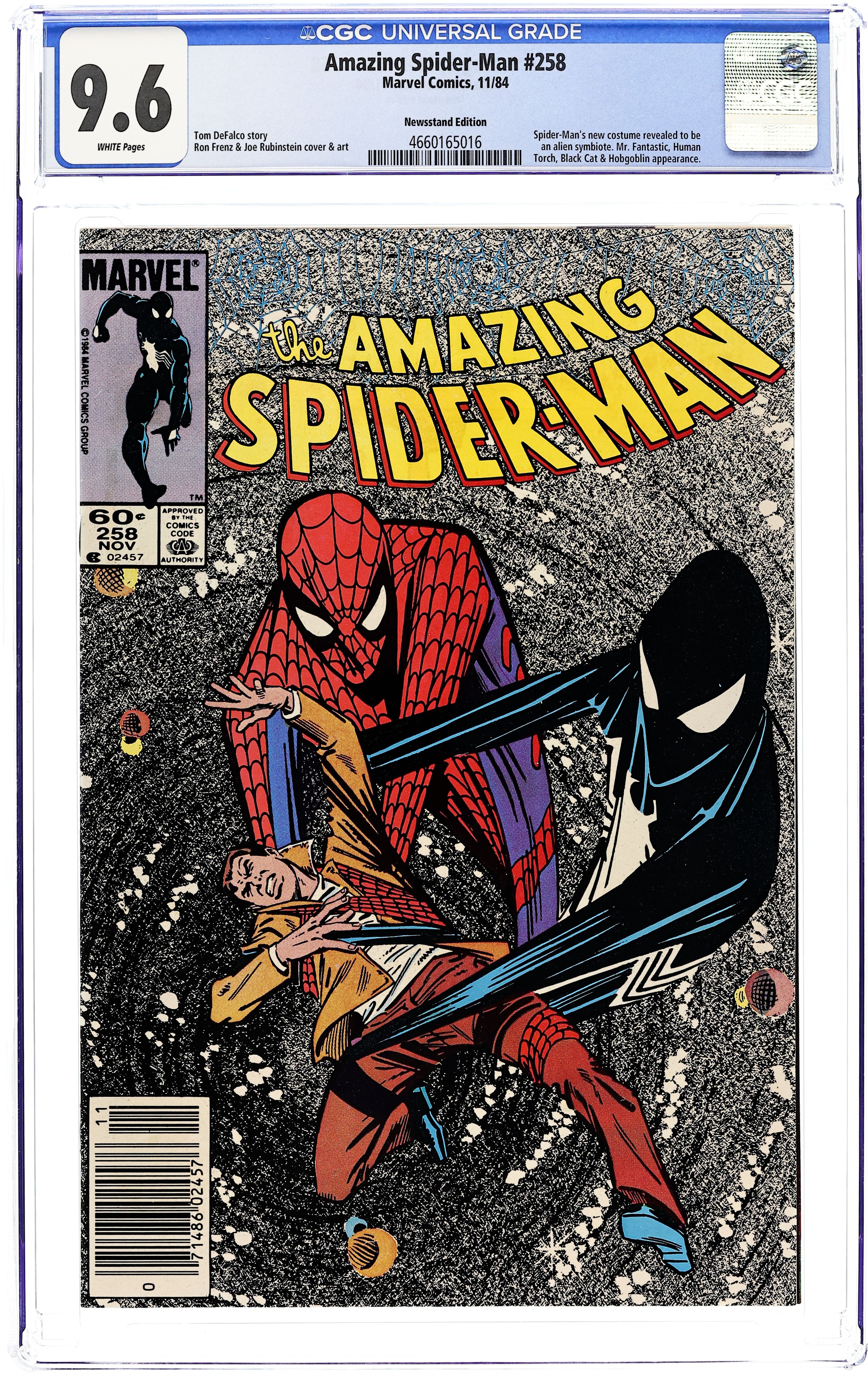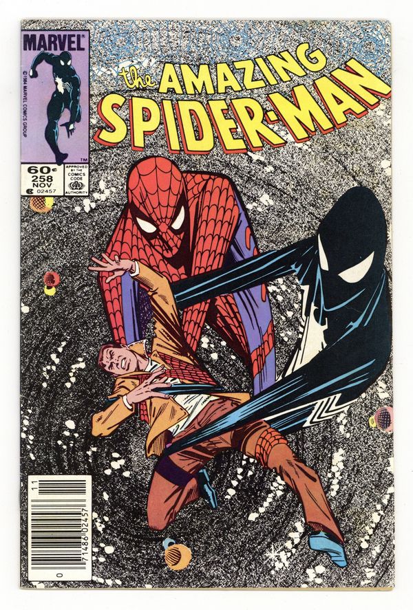 $18.50Newsstand Edition. "The Sinister Secret of Spider-Man's New Costume!" Guest-starring Mr. Fantastic and the Human Torch. Script by Tom DeFalco. Pencils by Ron Frenz. Inks by Joe Rubinstein. Cover by Ron Frenz and Joe Rubinstein. Chaos erupts at 410 Chelsea when Mary Jane Watson and the Black Cat meet inside Peter Parker's apartment! Wow, what a shocking development! To say that the web-slinger has some explaining to do...would be the understatement of the year! After the dust settles, the wall-crawler swings over to the Baxter Building to let Reed Richards analyze his new black costume. When Spider-Man learns his costume is "alive," he tries to pull it off; but the alien symbiote has other ideas! Can the Fantastic Four help Spidey with his major wardrobe malfunction? Cameo appearances by the Rose, Hobgoblin, and Puma. (Notes: The Black Cat and Mary Jane Watson are formally introduced to one another in Spectacular Spider-Man 123. The cover does not display the typical UPC box in the lower left-hand corner. This issue was reprinted in Marvel Tales 272.) 36 pages. Cover price $0.60.