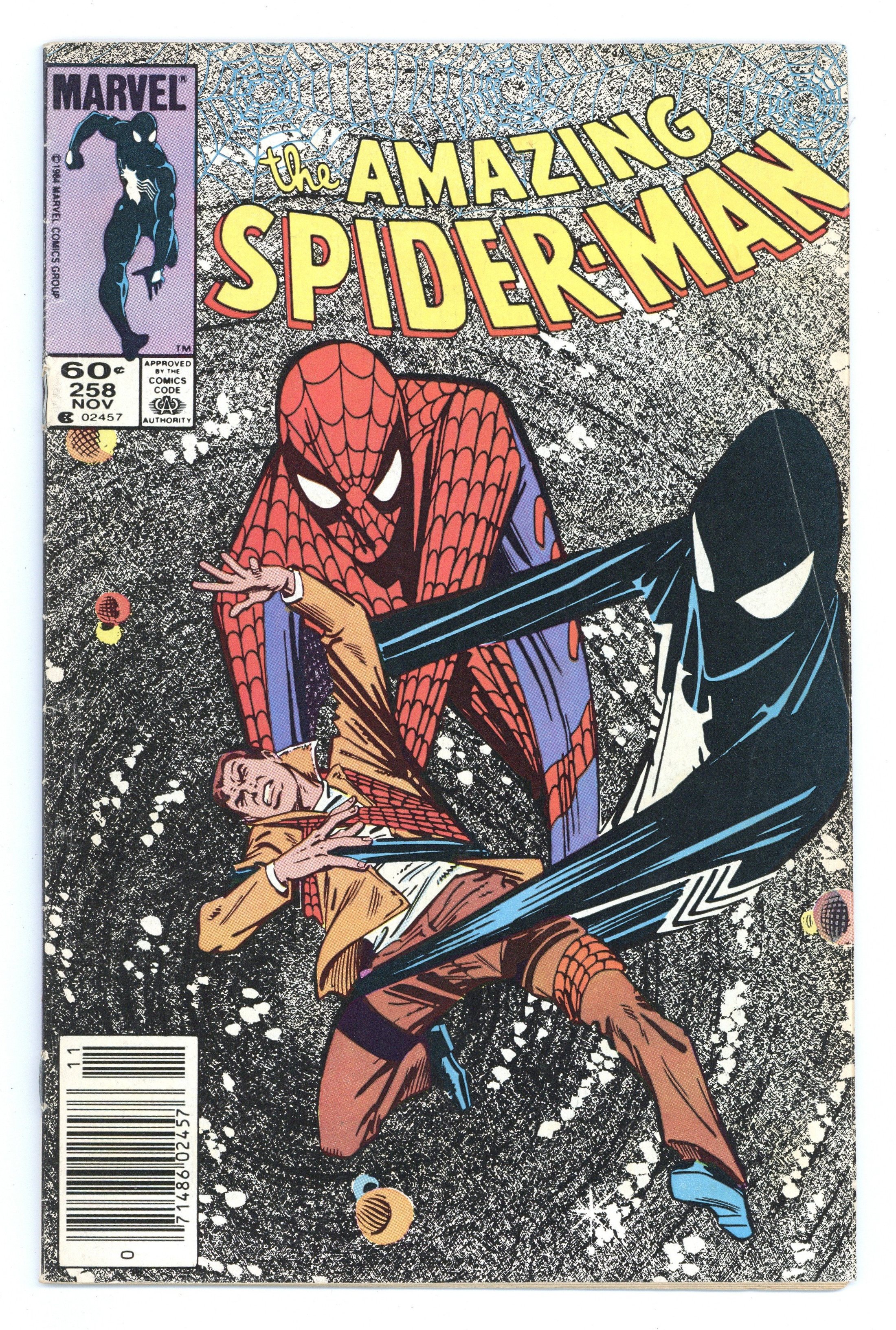 Newsstand Edition. "The Sinister Secret of Spider-Man's New Costume!" Guest-starring Mr. Fantastic and the Human Torch. Script by Tom DeFalco. Pencils by Ron Frenz. Inks by Joe Rubinstein. Cover by Ron Frenz and Joe Rubinstein. Chaos erupts at 410 Chelsea when Mary Jane Watson and the Black Cat meet inside Peter Parker's apartment! Wow, what a shocking development! To say that the web-slinger has some explaining to do...would be the understatement of the year! After the dust settles, the wall-crawler swings over to the Baxter Building to let Reed Richards analyze his new black costume. When Spider-Man learns his costume is "alive," he tries to pull it off; but the alien symbiote has other ideas! Can the Fantastic Four help Spidey with his major wardrobe malfunction? Cameo appearances by the Rose, Hobgoblin, and Puma. (Notes: The Black Cat and Mary Jane Watson are formally introduced to one another in Spectacular Spider-Man 123. The cover does not display the typical UPC box in the lower left-hand corner. This issue was reprinted in Marvel Tales 272.) 36 pages. Cover price $0.60.