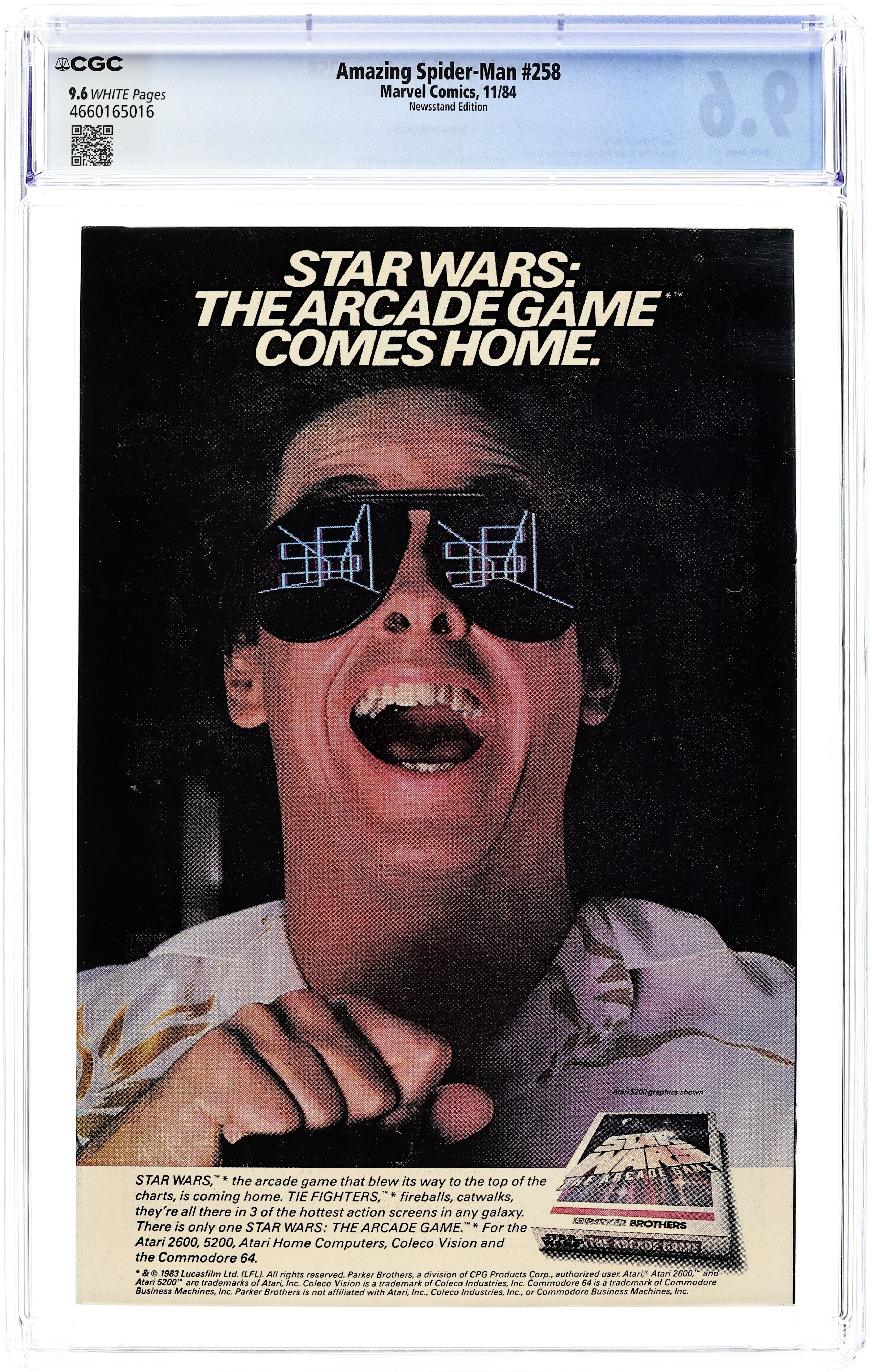 $20.00Newsstand Edition. "The Sinister Secret of Spider-Man's New Costume!" Guest-starring Mr. Fantastic and the Human Torch. Script by Tom DeFalco. Pencils by Ron Frenz. Inks by Joe Rubinstein. Cover by Ron Frenz and Joe Rubinstein. Chaos erupts at 410 Chelsea when Mary Jane Watson and the Black Cat meet inside Peter Parker's apartment! Wow, what a shocking development! To say that the web-slinger has some explaining to do...would be the understatement of the year! After the dust settles, the wall-crawler swings over to the Baxter Building to let Reed Richards analyze his new black costume. When Spider-Man learns his costume is "alive," he tries to pull it off; but the alien symbiote has other ideas! Can the Fantastic Four help Spidey with his major wardrobe malfunction? Cameo appearances by the Rose, Hobgoblin, and Puma. (Notes: The Black Cat and Mary Jane Watson are formally introduced to one another in Spectacular Spider-Man 123. The cover does not display the typical UPC box in the lower left-hand corner. This issue was reprinted in Marvel Tales 272.) 36 pages. Cover price $0.60.