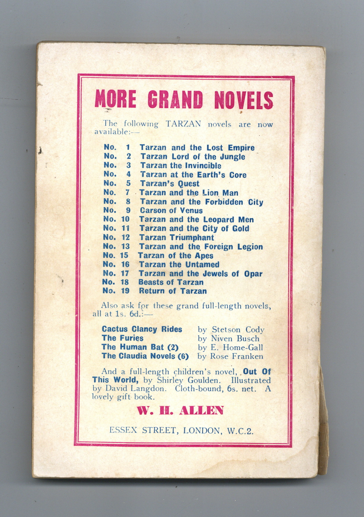 Published 1950 by Mark Goulden Ltd..$17.00Digest-sized reprints of Tarzan novels by ERB from the UK. This issue: Tarzan of the Apes. 5" x 7", 136 pages, text.