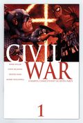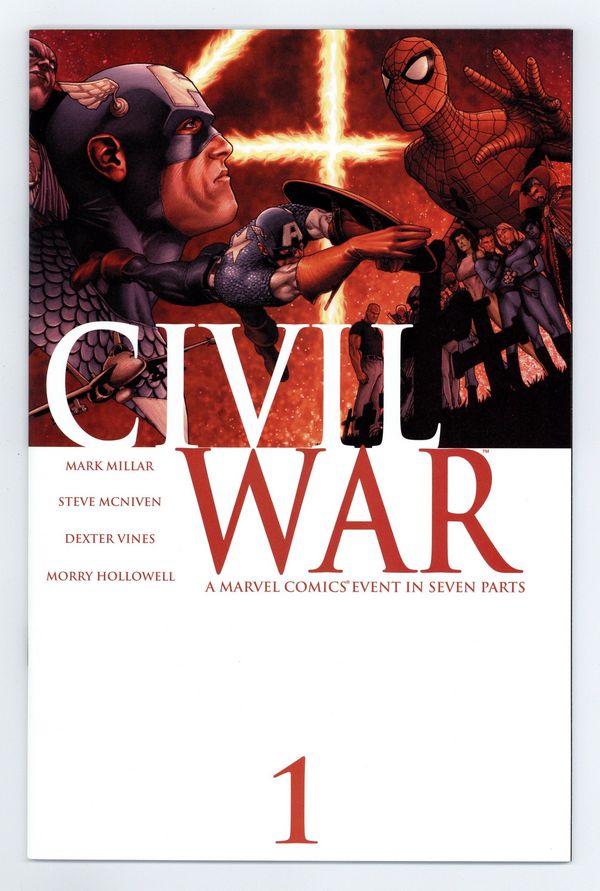 Tags: Civil War (Marvel) (part 1)$20.00Written by Mark Millar. Pencils & Wraparound Cover by Steve McNiven. A conflict has been brewing in the Marvel Universe for over a year, threatening to pit friend against friend, brother against brother--and all it will take is a single misstep to cost thousands their lives and ignite the fuse! As the war claims its first victims, no one is safe as teams, friendships, and families begin to fall apart. Civil War, a Marvel Comics event in seven parts, stars Spider-Man, the New Avengers, the Fantastic Four, the X-Men and the entirety of the Marvel pantheon! Cover price $3.99.