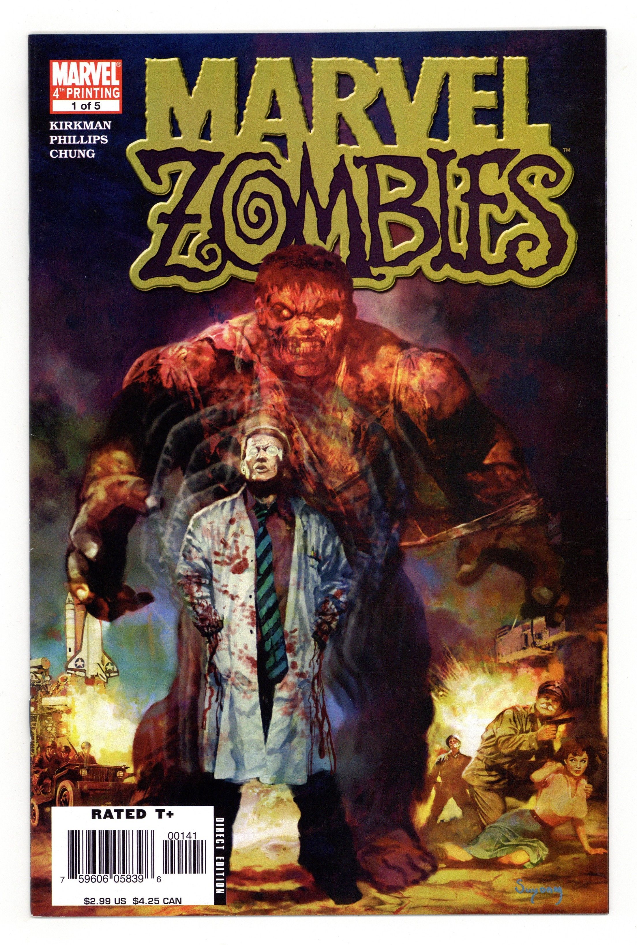 4th Printing Variant Cover - Written by ROBERT KIRKMAN Penciled by SEAN PHILLIPS Cover by ARTHUR SUYDAM. Torn from the pages of Ultimate Fantastic Four! On an Earth shockingly similar to the Marvel Universe's, an alien virus has mutated all of the world's greatest super heroes into flesh-eating monsters! It took them only hours to destroy life as we know it-but what happens when they run out of humans to eat?!? Follow their search for more food-and witness the arrival of the Silver Surfer! Cover price $2.99.