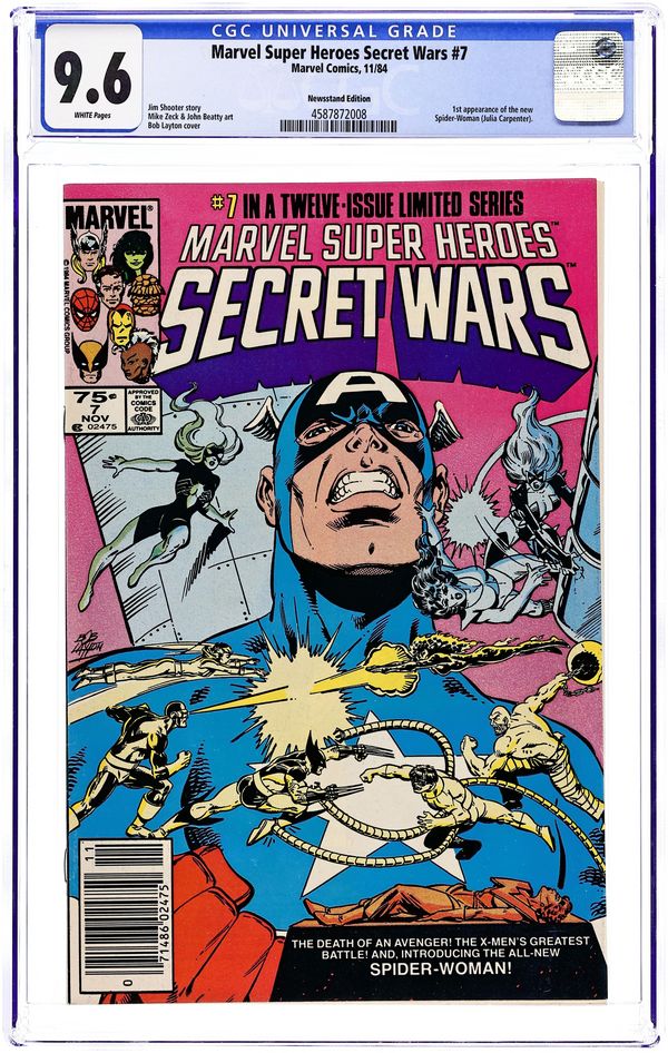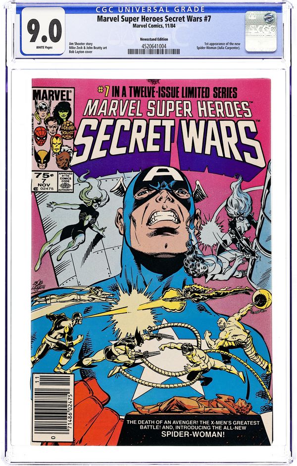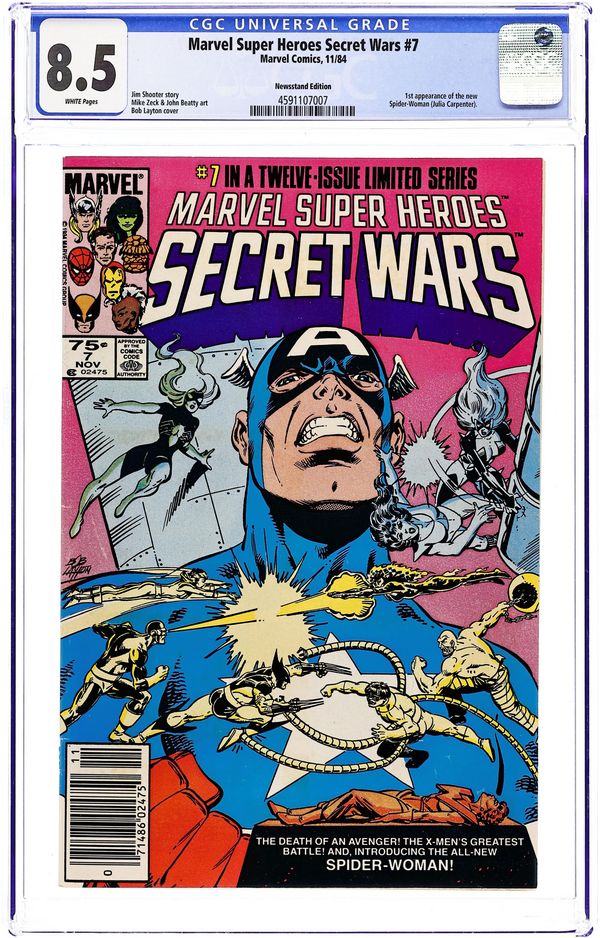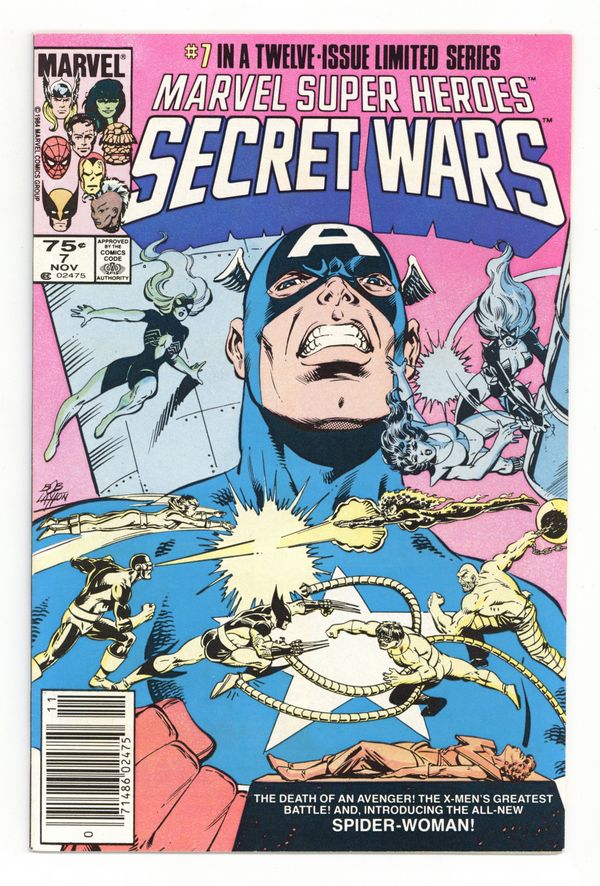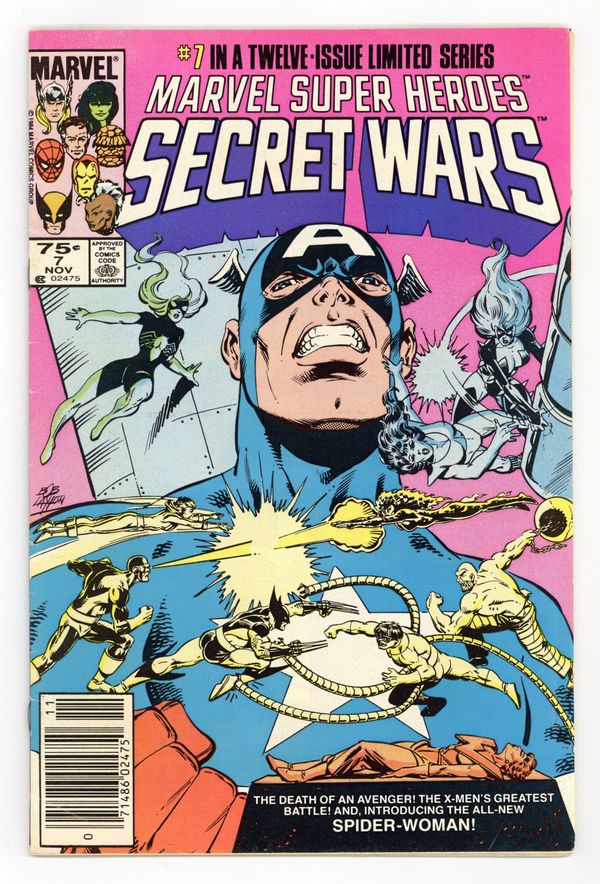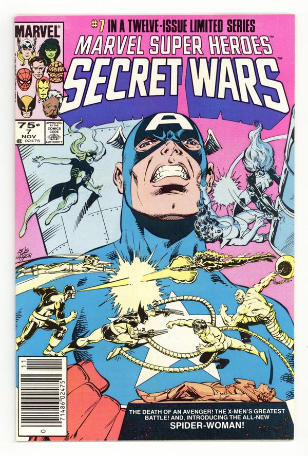 Newsstand Edition. 1st appearance of Spider-Woman II (Julia Carpenter). "Berserker!" Part 7 of 12. Story by Jim Shooter. Art by Mike Zeck and John Beatty. Introducing Marvel's newest super-hero, Spider-Woman, a refugee from the displaced Denver, Colorado (NOTE: The Beyonder created Battleworld from pieces of hundreds of worlds from across the universe, Denver was one of those pieces). Plus, when the villains dump the Wasp's lifeless body into the heroes' camp, the Savage She Hulk decides to pay the bad guys a visit for some payback. But, has the emerald heroine finally bitten off more than she can chew? 36 pages, full color. Cover price $0.75.