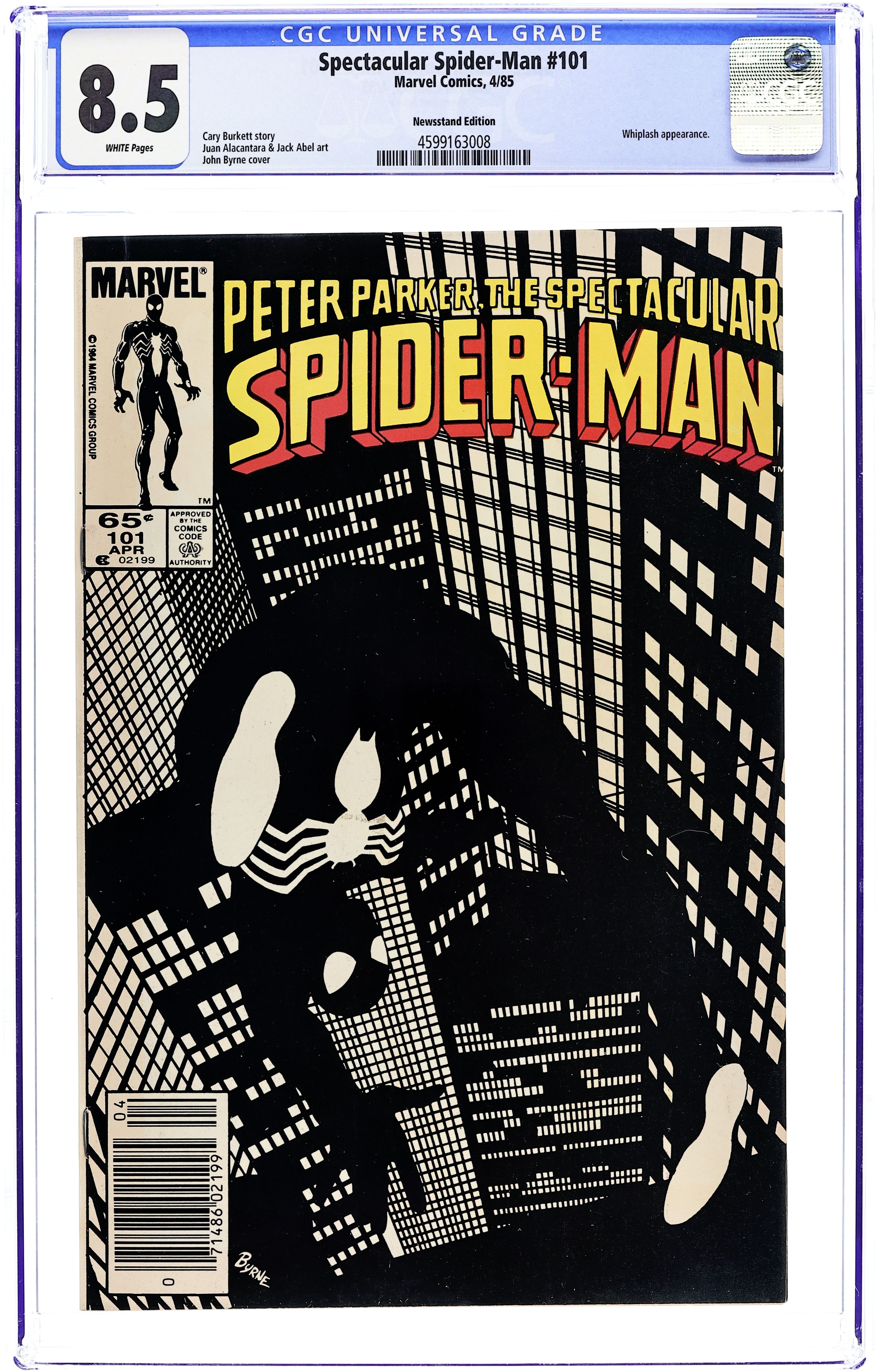 Newsstand Edition. "Echoes" Script by Cary Burkett. Pencils by Juan Alacantara. Inks by Jack Abel. Cover by John Byrne. A new era begins for the Spectacular Spider-Man as the Black Cat has departed his life. However, the breakup with Felicia has left the web-slinger in a melancholy mood, so he visits the site of his greatest heartbreak...the Brooklyn Bridge. The events of Amazing Spider-Man 121 still haunt the wall-crawler, but life goes on...and so does crime in the big city. When Blacklash takes a hostage after bungling a burglary attempt, the spectacular one swings into action! Flashback cameos of Gwen Stacy and the Green Goblin. First 65¢ issue. (Note: The letters page includes a statement of ownership: average print run 337,108; average paid circulation 180,498.) 32 pages Cover price $0.65.