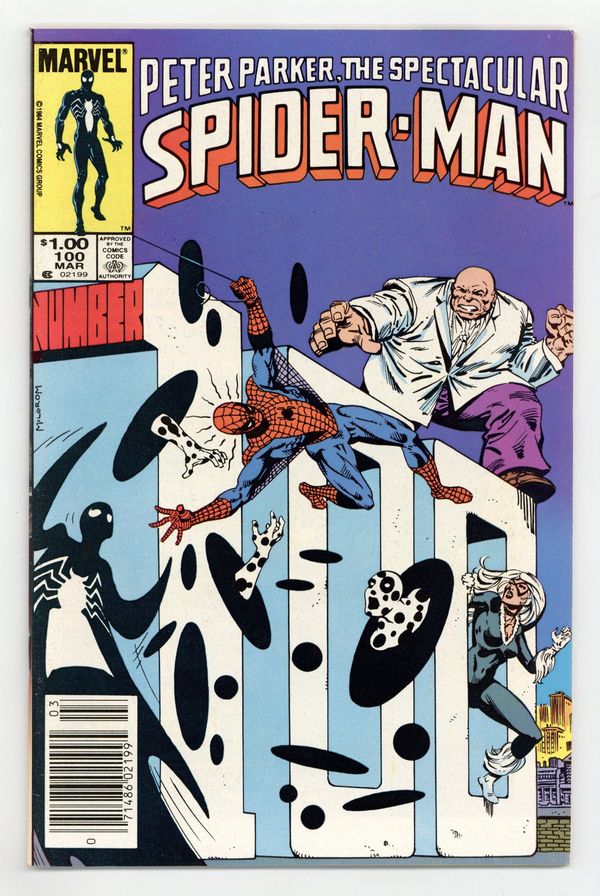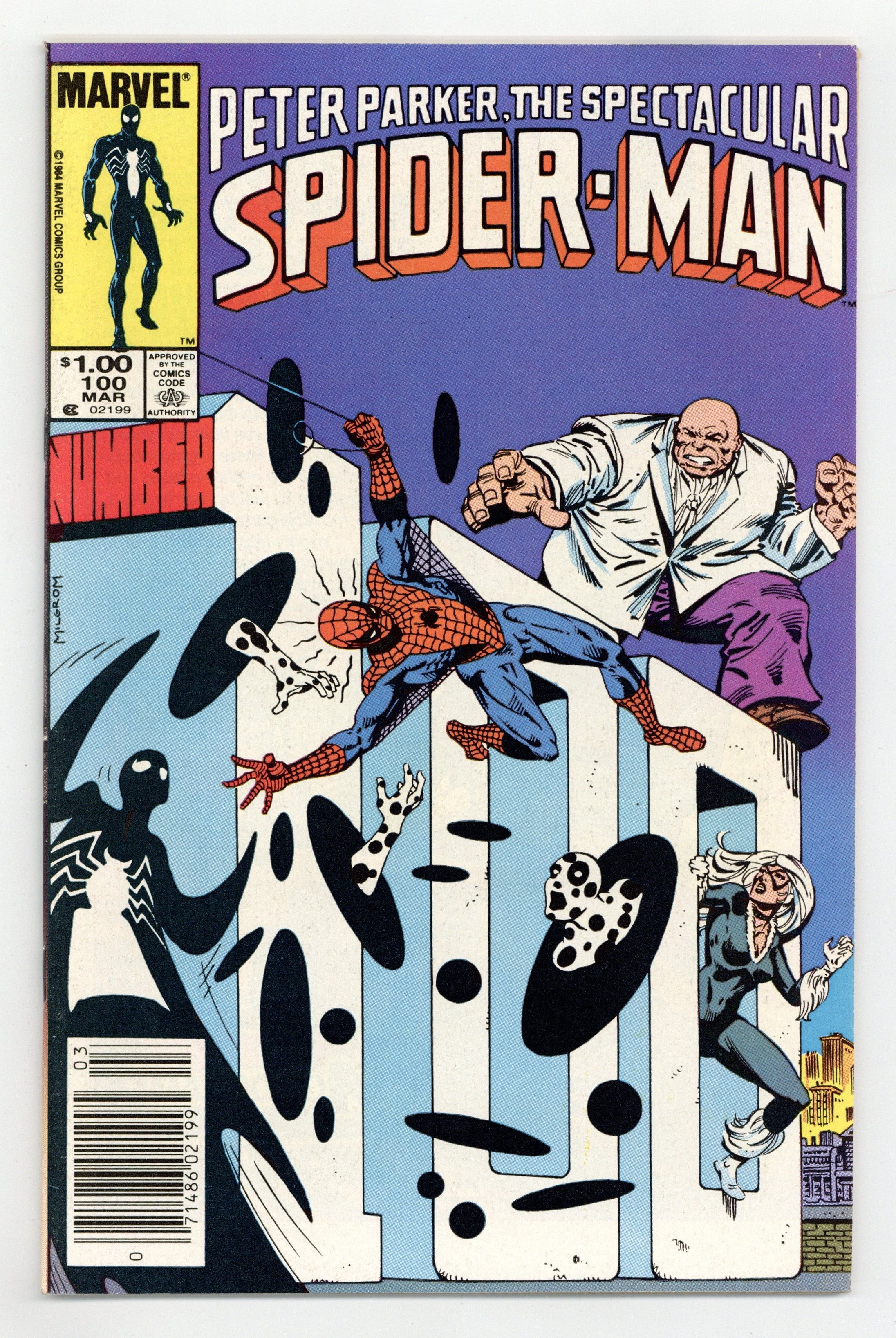 Newsstand Edition. "Breakin'!" Double-sized issue. Script and Pencils by Al Milgrom. Inks by Vince Colletta and Geof Isherwood. Cover by Al Milgrom. The wall-crawler returns to the Kingpin's skyscraper, but again runs into the pesky Spot! While Spider-Man fights the Spot, the Black Cat confronts the Kingpin and learns the tragic secret of her bad luck powers. A dejected Felicia elects not to attack the massive crime boss, but a few minutes later...the Spectacular Spider-Man does! It's a great slugfest between the Kingpin and the web-slinger! Meanwhile, as the battle is raging at the Kingpin's tower, the alien symbiote slips into Peter Parker's closet...and waits! (Note: The alien symbiote plot line continues in Web of Spider-Man 1.) 48 pages Cover price $1.00.