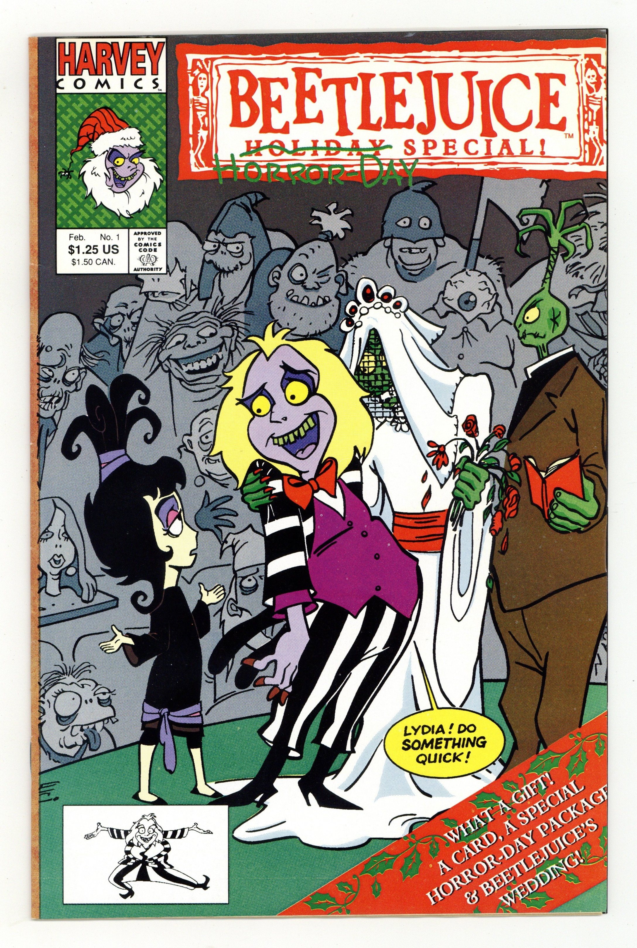 Get Me to the Church on Slime, script by Michael Gallagher, pencils by Dave Manak, inks by Ken Selig and Jorge Pacheco; Beetlejuice is forced into a "shotgum" wedding. Never a Doll Moment, script by Angelo Decesare, pencils by Howie Post, inks by Ken Selig; Beetlejuice wants to get Lydia a Barfie doll for Christmas, but he has to fight the Witch Doctor for the last one. Beetlejuice Christmas card activity page. 32 pgs. $1.25. Cover price $1.25.