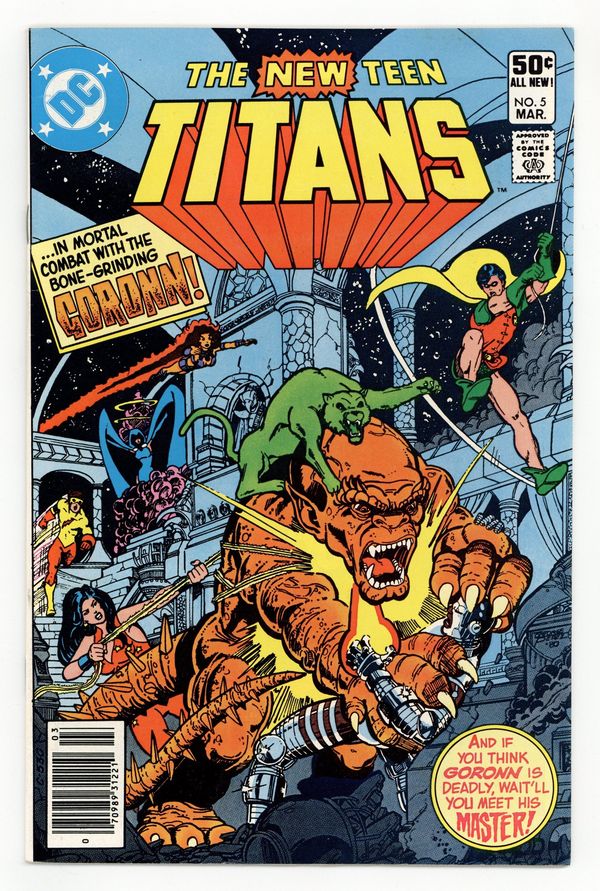 Tags: Teen Titans$15.75Newsstand Edition. Trigon and his warrior Goronn arrive on Earth with conquest on the brain in "Trigon Lives!" Script by Marv Wolfman, pencils by Curt Swan, inks by Romeo Tanghal. Psimon. George Perez cover. First full appearance of Trigon. Cover price $0.50.