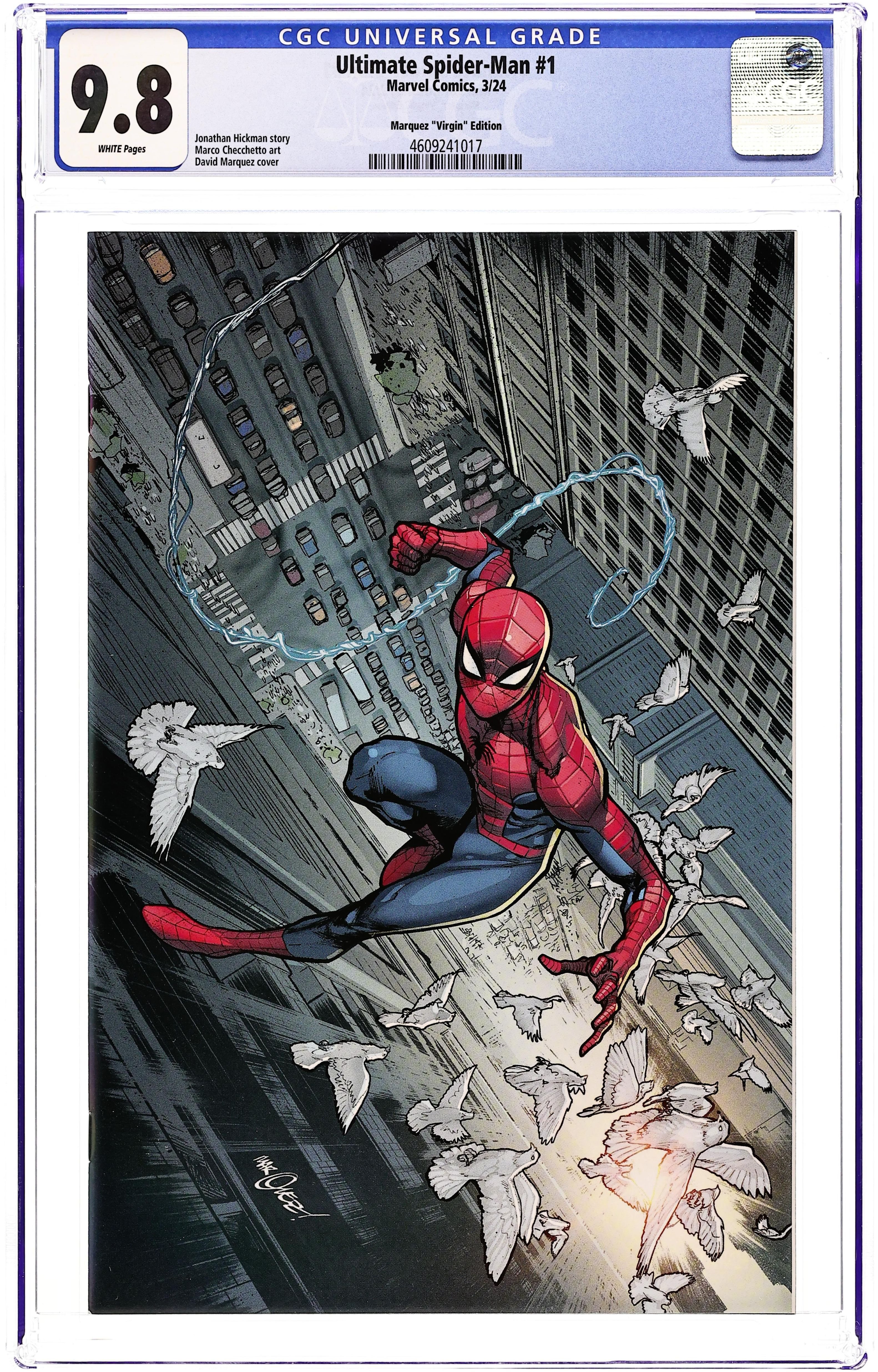 Limited 1 for 100 Retailer Incentive Variant Cover. Written by Jonathan Hickman. Art by Marco Checchetto. Cover by David Marquez. THE NEW ULTIMATE SPIDER-MAN FOR A NEW ULTIMATE UNIVERSE! Visionary writer Jonathan Hickman (HOUSE OF X/POWERS OF X) and acclaimed artist Marco Checchetto (DAREDEVIL) bring you a bold new take on Spider-Man, with this, the debut title of the new line of Ultimate Comics! After the events of ULTIMATE INVASION, the world needs a hero...who will rise up to take on that responsibility? Prepare to be entangled in a web of mystery and excitement as the all-new ULTIMATE SPIDER-MAN comic redefines the wall-crawler for the 21st Century! 48 pages, full color. Rated T Cover price $5.99.