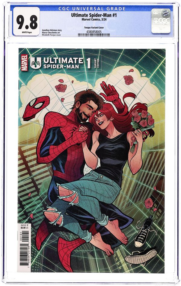 Written by Jonathan Hickman. Art by Marco Checchetto. Cover by Elizabeth Torque. THE NEW ULTIMATE SPIDER-MAN FOR A NEW ULTIMATE UNIVERSE!Visionary writer Jonathan Hickman (HOUSE OF X/POWERS OF X) and acclaimed artist Marco Checchetto (DAREDEVIL) bring you a bold new take on Spider-Man, with this, the debut title of the new line of Ultimate Comics! After the events of ULTIMATE INVASION, the world needs a hero...who will rise up to take on that responsibility? Prepare to be entangled in a web of mystery and excitement as the all-new ULTIMATE SPIDER-MAN comic redefines the wall-crawler for the 21st Century! 48 pages, full color. Rated T Cover price $5.99.