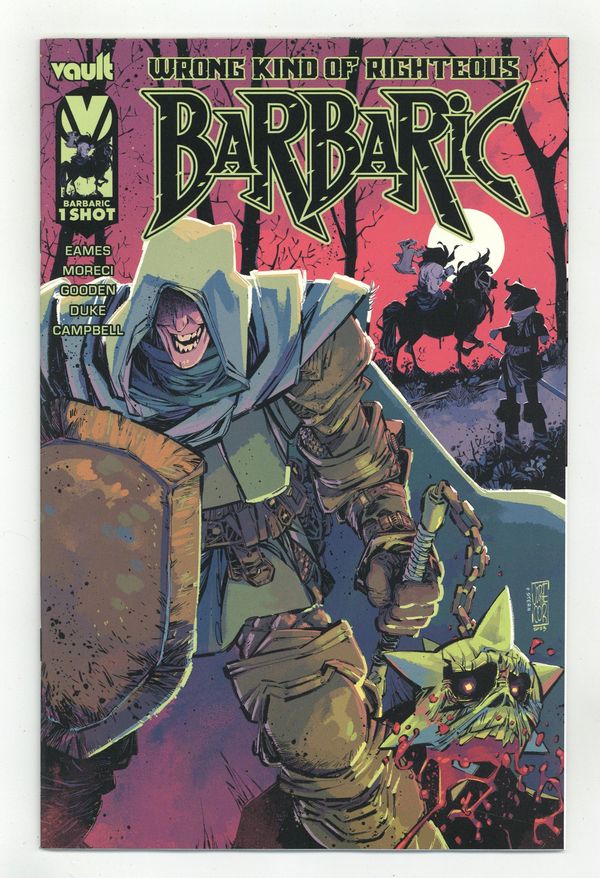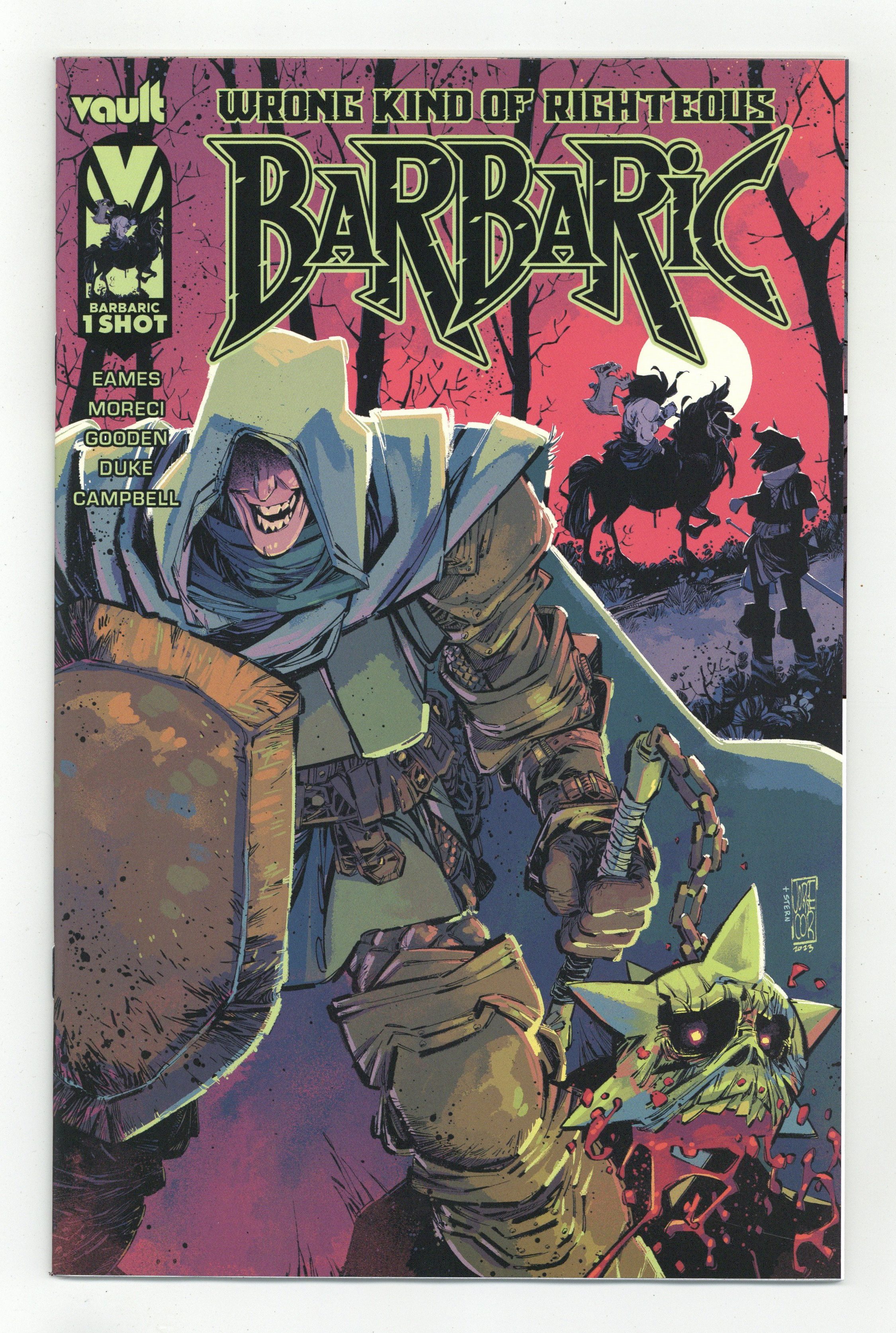 Published Nov 2023 by Vault Comics.$6.40Written by Michael Moreci, Nicholas Eames. Art by Nathan Gooden. Cover by Jorge Corona. Double-sized one-shot introducing an all-new talking weapon, Flail! Best-selling, Gemmell Award-winning Fantasy author Nicholas Eames (Kings of the Wyld) teams up with Michael Moreci, Nathan Gooden, and Julius Ohta to tell the tale of Sir Borys the Righteous Paladin and his trusty, talking Flail, as he enlists the help of Owen, Axe, and Soren on his noble path. There will be virtuous bloodshed! There will be wailing protests! There will be two talking weapons! And there will be wyvern burgers served (for better or worse) with pickles! 48 pages, full color. Cover price $19.98.