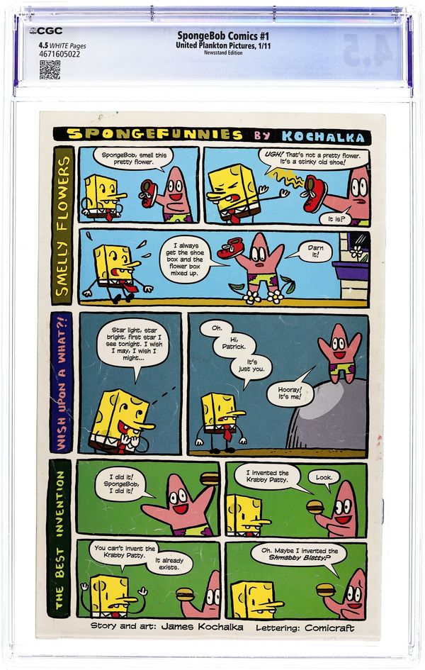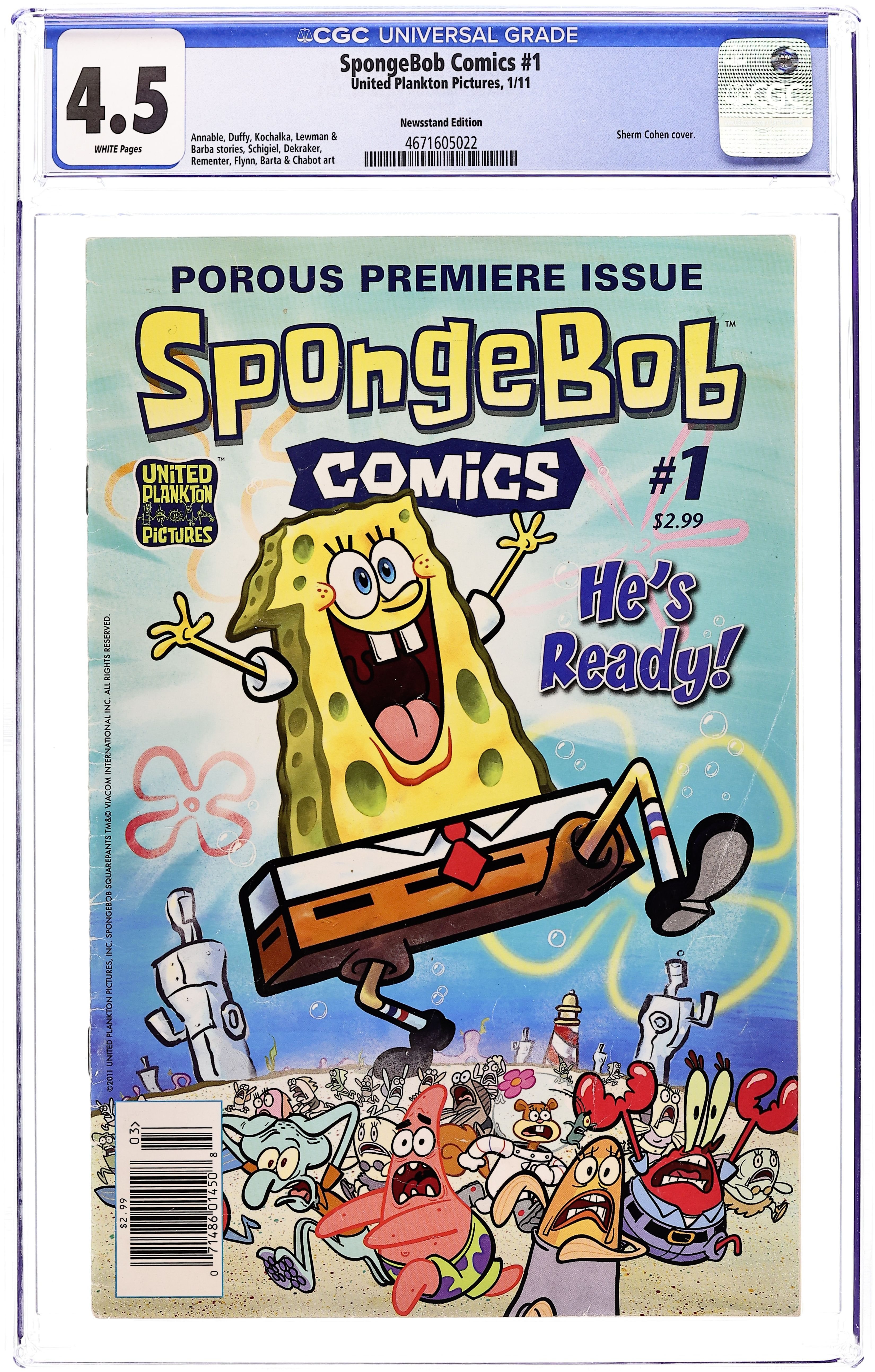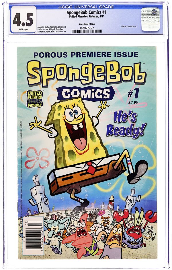 Newsstand Edition. (W/A) Kochalka, Barta, Sikoryak, Various Are you ready for the comic book premiere of the world's most popular fry-cooking sponge?! This first issue is a whale of a collection of comics by talented indy, mainstream, and animation cartoonists - James Kochalka (Johnny Boo, American Elf), Hilary Barta (Fear Agent), Graham Annable (Grickle), Gregg Schigiel (X-Babies), Jacob Chabot (Mighty Skullboy Army, X-Babies), and more! In this issue: SpongeBob has a recurring nightmare about his favorite cereal; Squidward introduces music to the Krusty Krab; and Mermaid Man is freaked out by a fan who won't... stop... staring! Also: Patrick and SpongeBob team up for the most idiotic joke ever; SpongeBob learns to glow; and readers are invited to draw the absorbing one's new hairdo! All this, plus a page of SpongeFunnies by James Kochalka and a cover pinup, equals a ship-shape maiden voyage! Cover price $2.99.