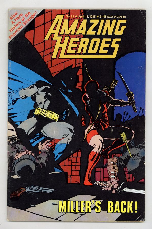 Published Apr 1985 by Fantagraphics.$40.00In this issue: Frank Miller interview (guest appearance by Bill Sienkiewicz); Hero History of the Phantom Stranger; Star Hawks by Gil Kane and Roger McKenzie - "Deathsearch" concludes. Plus: Editorial; Newsflashes; Coming Distractions; The Comic Book Heroes book excerpt; The Golden Age Directory - JSA and the Marvel Family; Comics in Review by R.A. Jones - The Badger, The Shadow War of Hawkman, Captain Britain, Peter Porker the Spectacular Spider-Ham, Somerset Holmes, Moonshadow; Amazing Readers. Batman/Elektra cover by Frank Miller and Lynn Varley. Cover price $1.95.