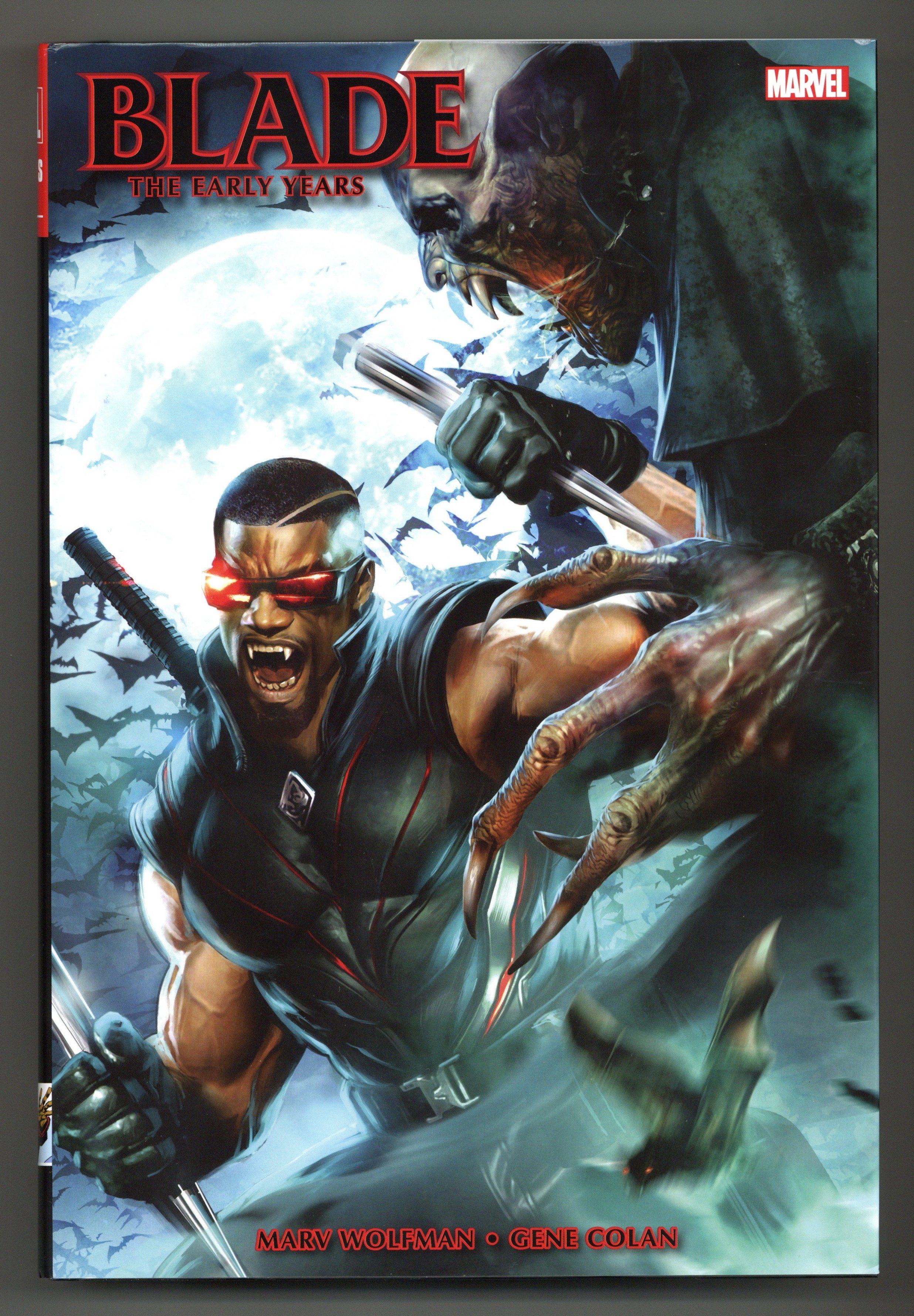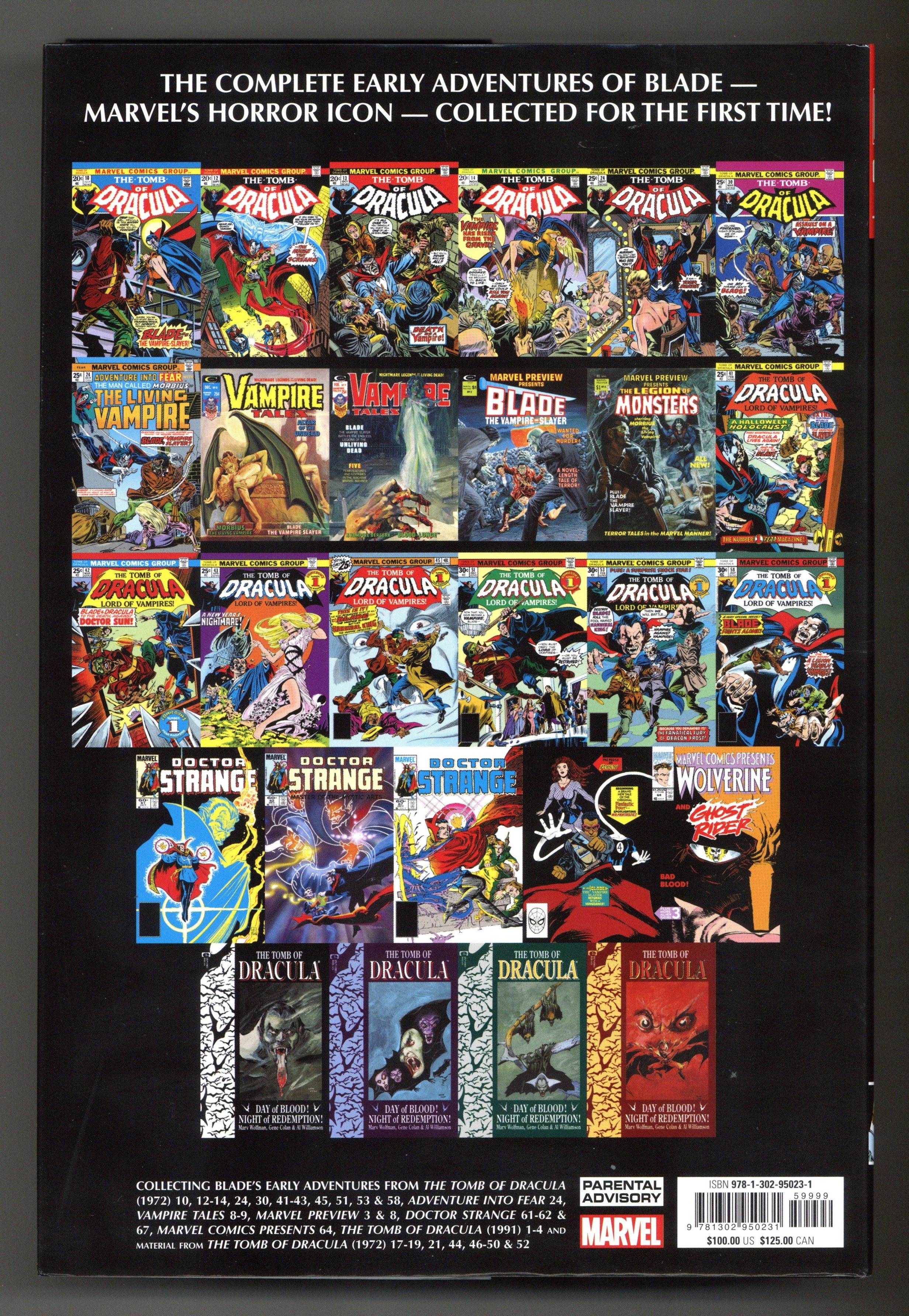 1st printing. Collects The Tomb of Dracula (1972-1979 1st Series) #10, 12-14, 24, 30, 41-43, 45, 51, 53 and 58; Marvel Preview (1975-1981 Magazine) #3; Fear (1970=1975 Marvel) #24; Doctor Strange (1974-1987 2nd Series) #61-62 and 67, and material from The Tomb of Dracula (1972-1979 1st Series) #17-19, 21, 44, 46-50 and 52; Vampire Tales (1973-1975) #8-9; Marvel Preview (1975-1981 Magazine) #8; and Marvel Comics Presents (1988-1995) #64. Written by Marv Wolfman, Chris Claremont, Steve Gerber, Roger Stern, and Marcus McLaurin. Art by Gene Colan, P. Craig Russell, Tony DeZunga, Rico Rival, Dan Green, Steve Leialoha, Malcolm Davis, Jacki Abel, Tom Palmer, Joseph Adiletta, and Al Williamson. Cover by Dave Wilkins. Blade hit the comics scene in the 1970s - a time when horror movies were all the rage and Black cinema was introducing bold new action heroes who defied authority. Blade immediately changed the stakes of Marv Wolfman and Gene Colan's TOMB OF DRACULA, bringing a sense of unstoppable determination as he pursued Deacon Frost, the vampire who killed his mother. And if a few other vampires died along the way, all the better! This Omnibus collects, for the first time, Blade's complete early adventures: from his influential role in TOMB OF DRACULA to his 1970s solo stories and his climactic battle against Dracula alongside Doctor Strange! Hardcover, 8 1/2-in. x 11-in., 720 pages, full color. Rated T+ Cover price $100.00.