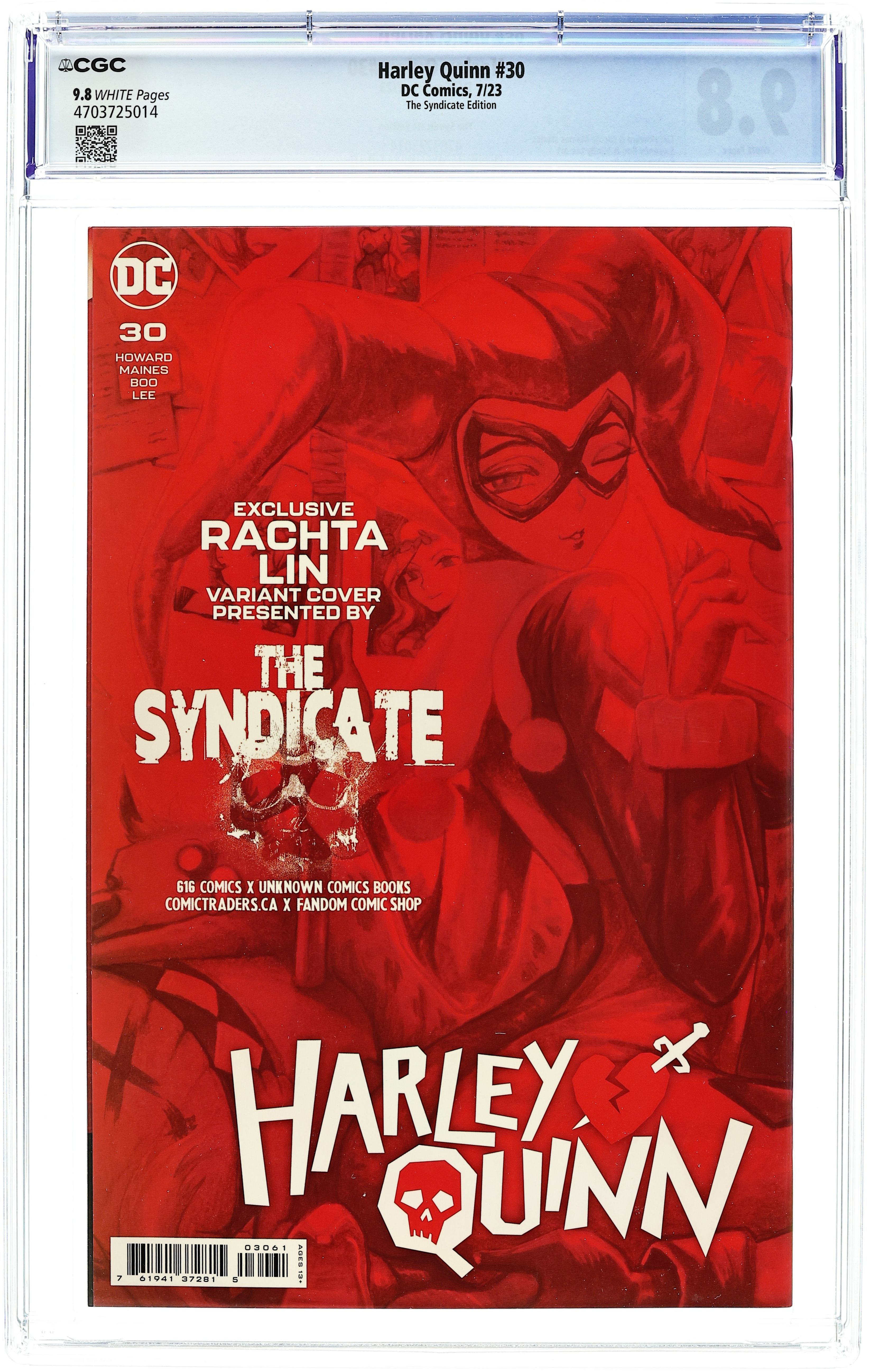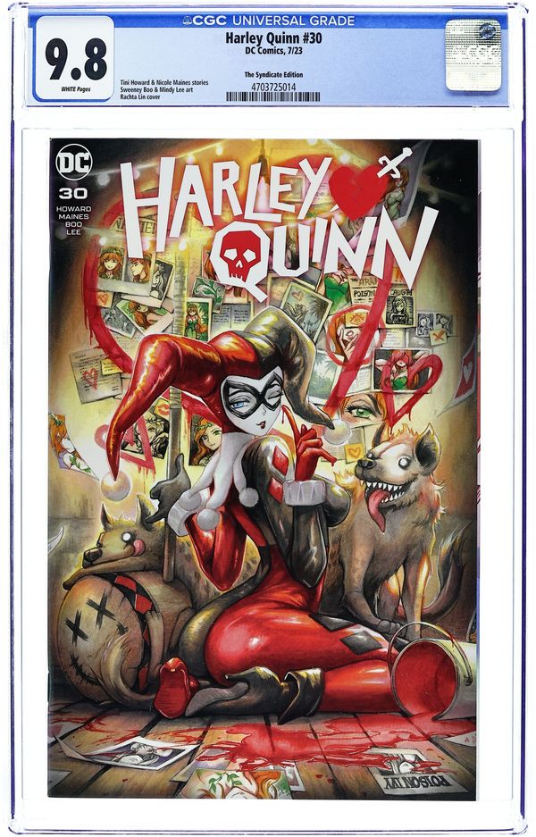 The Syndicate (The 616 Comics, Unknown Comics, Comic Traders, and Fandom Comic Shop) Exclusive Cover by Rachta Lin. Written by Tini Howard & Nicole Maines. Art by Sweeney Boo & Mindy Lee. Here I am in the midst of a veritable midlife extradimensional existential crisis of epic proportions, and if that's not bad enough...I got a giant, bloodthirsty, killer anthropo-whatsit rabbit man with a big ol' carrot-shaped axe to grind after me. Good thing I got my hyena spiritual advisors, Bud and Lou, to guide me on this fiendish foray into a frenzy of ferocious furballs. Plus: the introduction of my very own cosmic workout gear that is in no way an infringement on the Flash's intellectual property. Also, in this month's In-Continuity Dreams of Harley Quinn, we've cooked up a real doozy for ya! It's got swords, armor, fair maidens, and more side quests than you can shake your tuchus at! 40 pages, full color. Rated 13+