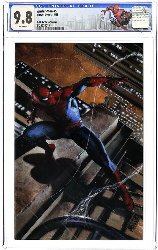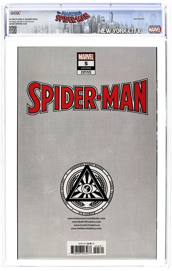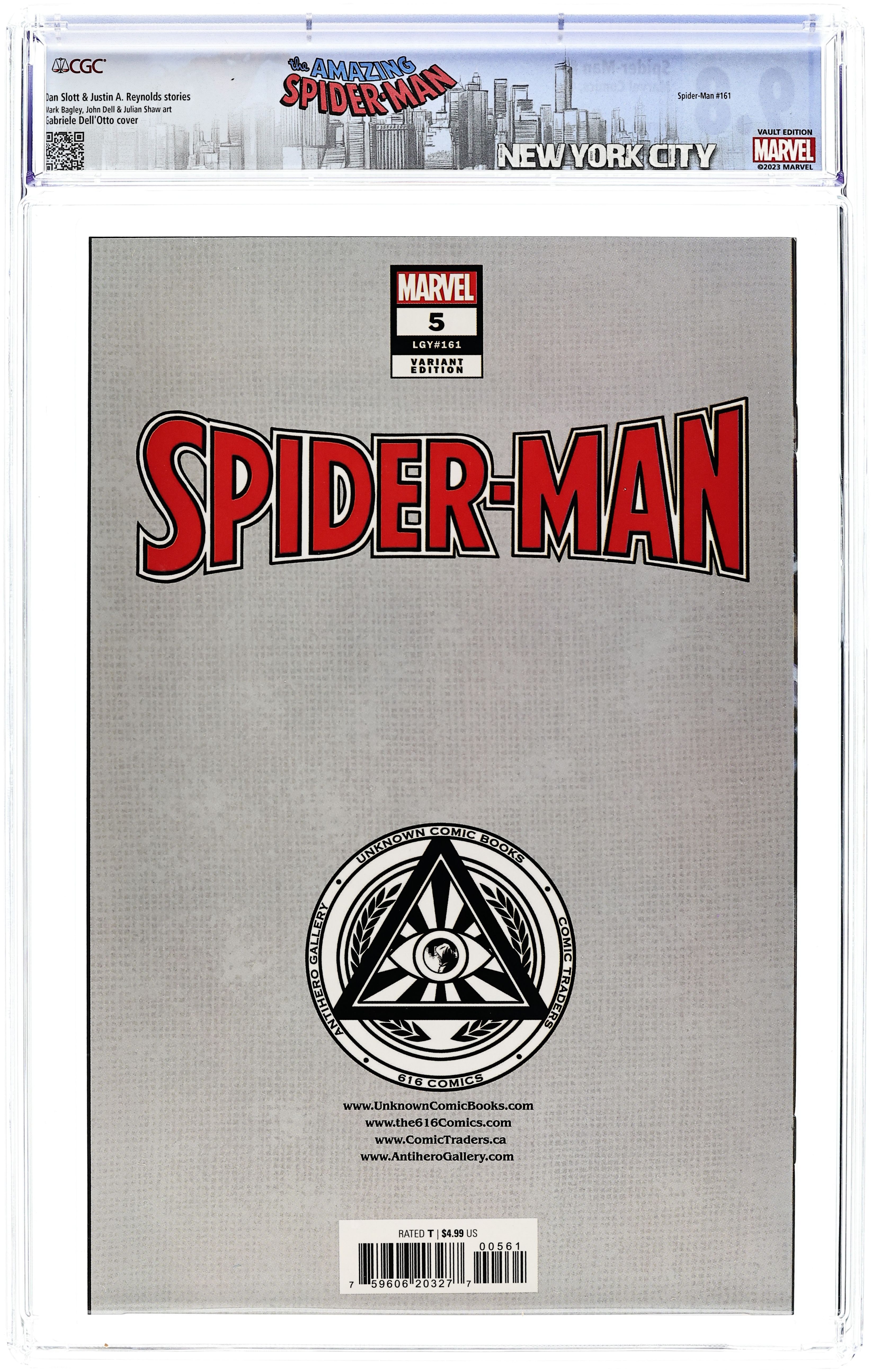 Comics Illuminati (Unknown Comics, The 616 Comics, AntiHero Gallery, and Comic Traders) exclusive Virgin Cover by Gabriele Dell'Otto. Written by Dan Slott. Art by Mark Bagley. "The End of the Spider-Verse" continues! See a new side of Peter Parker and the Spider-mythos! Shathra and her forces work towards the extinction of Arachnida sapiens. PLUS! This issue includes a special super heroic back-up story featuring Spider-Man and Photon celebrating Black History Month! 36 pages, full color. Rated T