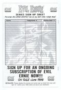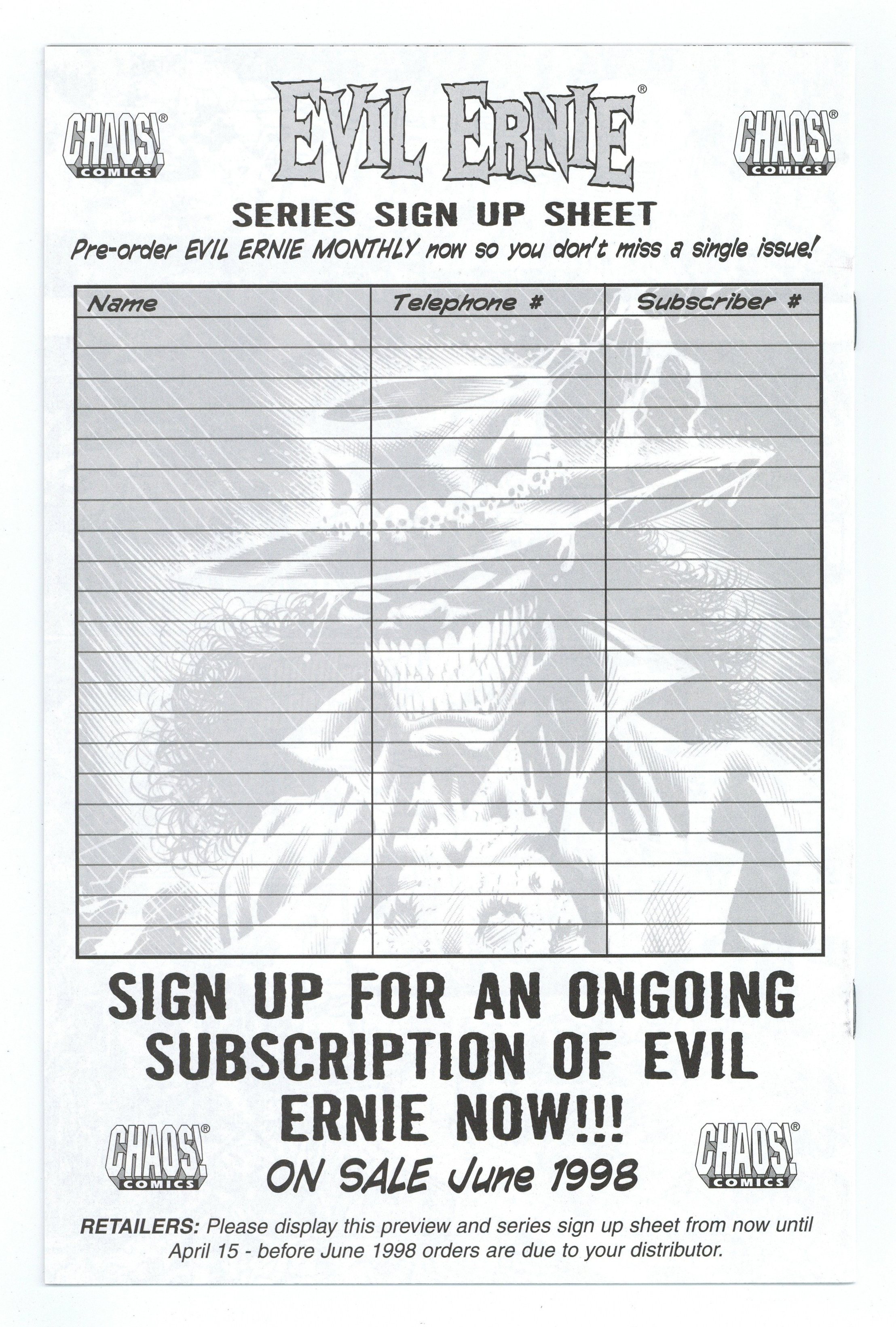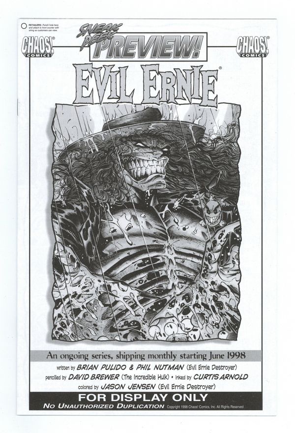 $200.00Retailer exclusive sneak peak at Evil Ernie (1998 Chaos) #1. Distributed to retailers for display only. Sign up sheet on back cover for pre-ordering a subscription to the series. 6-3/4" x 10-3/4", 16 pages, B&W.