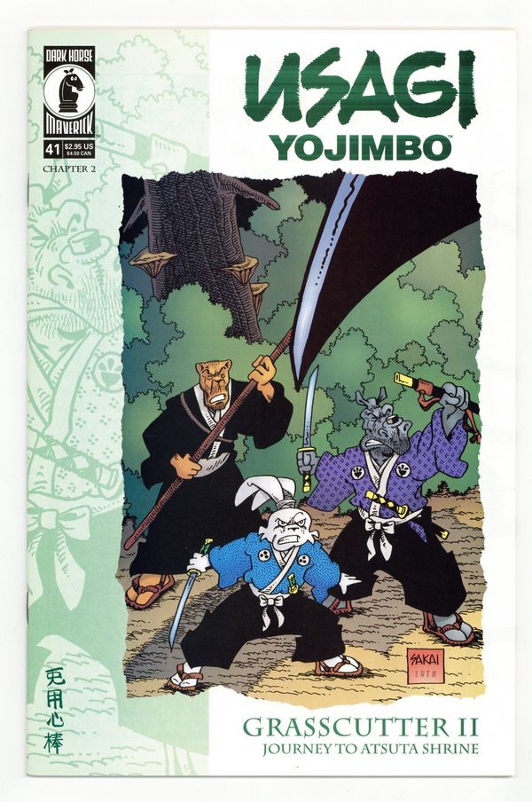 Published Sep 2000 by Dark Horse.$12.75Grasscutter II: Journey to Atsuta Shrine Part 3 of 7 - Story and art by Stan Sakai. In the latest chapter of the follow-up to last year's award-winning Grasscutter series, Usagi and his companions continue on their journey to deliver the sword, Grasscutter, to Atsuta Shrine, unaware that two ninja clans are hot on their trail. When the group finds refuge for the night in a small way station, they are trapped by the Neko Ninja, leading to a dramatic confrontation between the Neko leader Chizu and Usagi. And if that's not enough, the killer bats swoop down! 32 pages, B&W. Cover price $2.95.