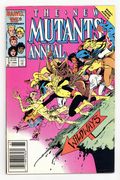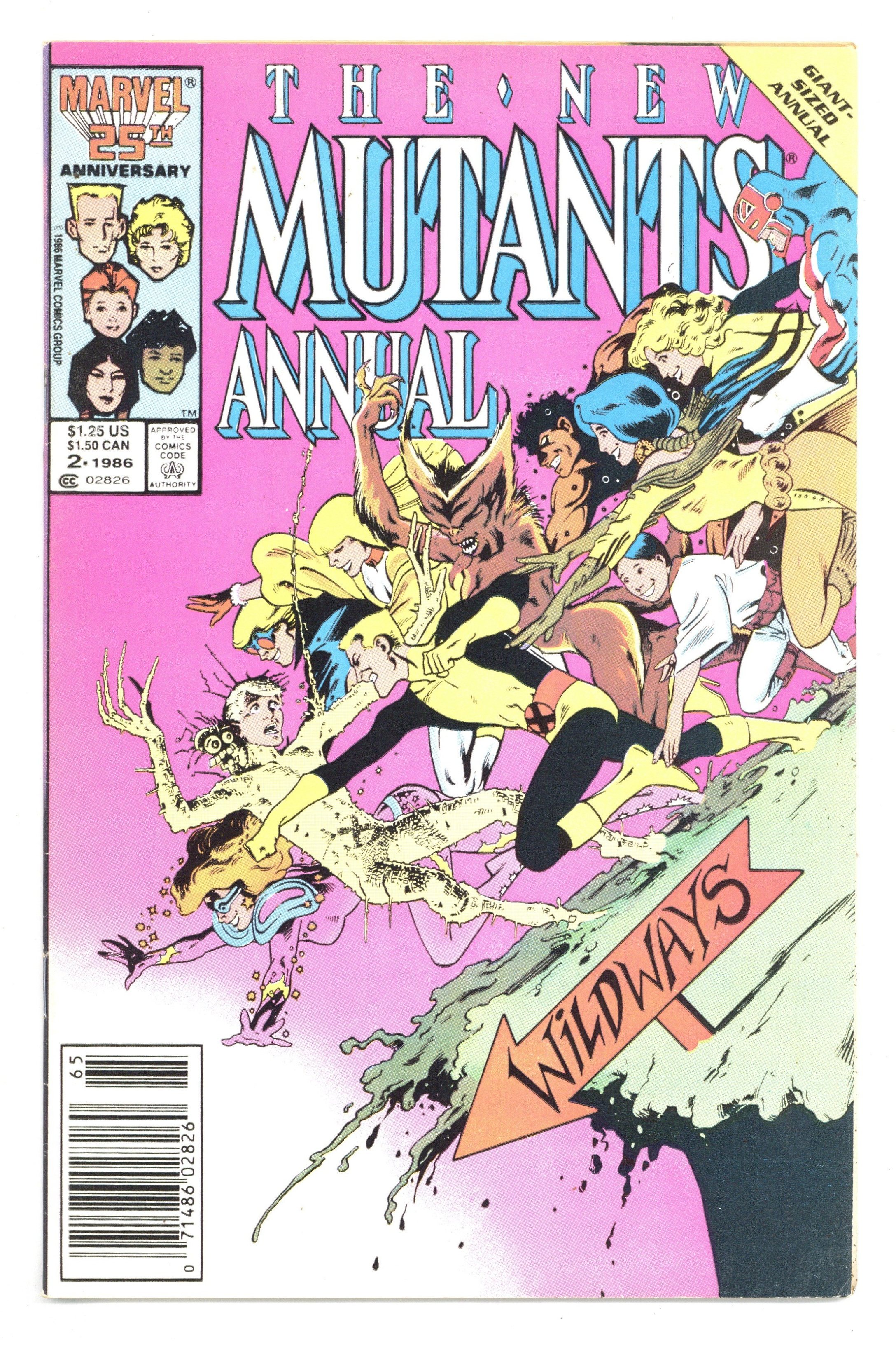 Newsstand Edition. First U.S. appearances of Psylocke and Meggan in "Why Do We Do These Things We Do?!" Mojo captures Betsy (giving her new eyes and the name Psylocke), then Wolfsbane, Sunspot, Karma's siblings and the Bratpack; the New Mutants meet Captain Britain; Cypher merges with Warlock. Characters: Cannonball, Cypher, Karma, Magik, Magma, Mirage, Sunspot, Warlock, Wolfsbane; GS: Captain Britain, Psylocke (Betsy Braddock; O; first U.S. appearance), Bratpack; V: Mojo, Spiral; GA: Meggan (first U.S. appearance); OC: Leong and Nga Xui Manh. Script by Chris Claremont, with art and cover by Alan Davis. Notes: This story occurs between New Mutants (1983 1st Series) #44 & #45; Spiral, Mojo and the Bratpack (Butch, Darla and Alfie) appear here following the Longshot limited series; a sequel to this story appears in Uncanny X-Men (1963) Annual #10. Cover price $1.25.
