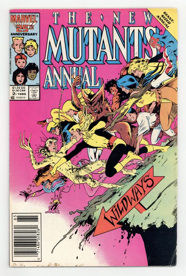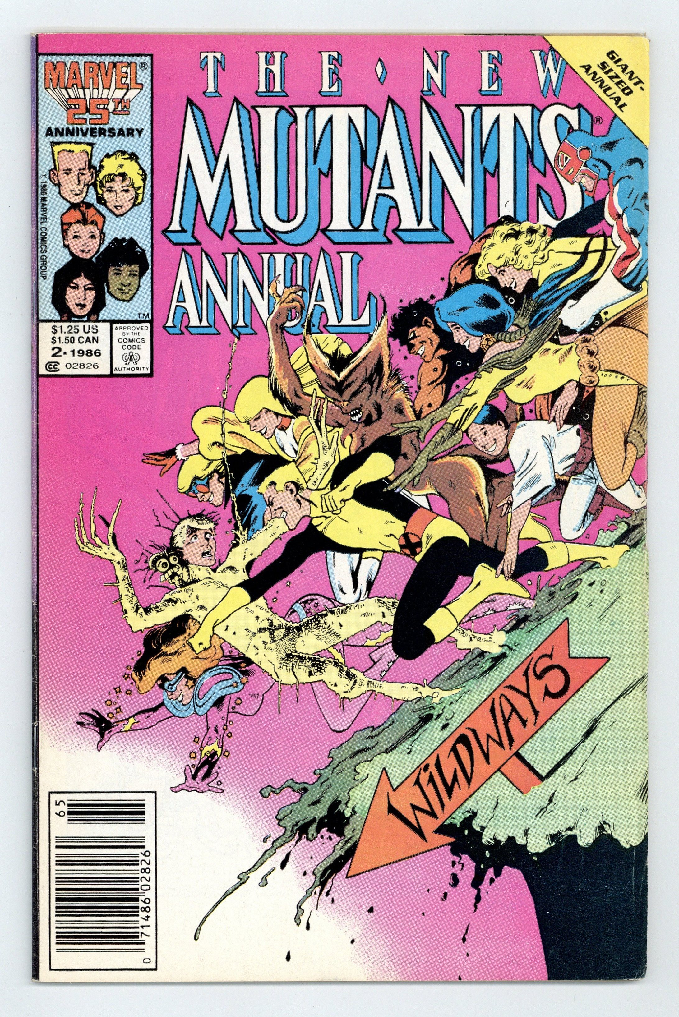 Tags: X-Men$22.50Newsstand Edition. First U.S. appearances of Psylocke and Meggan in "Why Do We Do These Things We Do?!" Mojo captures Betsy (giving her new eyes and the name Psylocke), then Wolfsbane, Sunspot, Karma's siblings and the Bratpack; the New Mutants meet Captain Britain; Cypher merges with Warlock. Characters: Cannonball, Cypher, Karma, Magik, Magma, Mirage, Sunspot, Warlock, Wolfsbane; GS: Captain Britain, Psylocke (Betsy Braddock; O; first U.S. appearance), Bratpack; V: Mojo, Spiral; GA: Meggan (first U.S. appearance); OC: Leong and Nga Xui Manh. Script by Chris Claremont, with art and cover by Alan Davis. Notes: This story occurs between New Mutants (1983 1st Series) #44 & #45; Spiral, Mojo and the Bratpack (Butch, Darla and Alfie) appear here following the Longshot limited series; a sequel to this story appears in Uncanny X-Men (1963) Annual #10. Cover price $1.25.