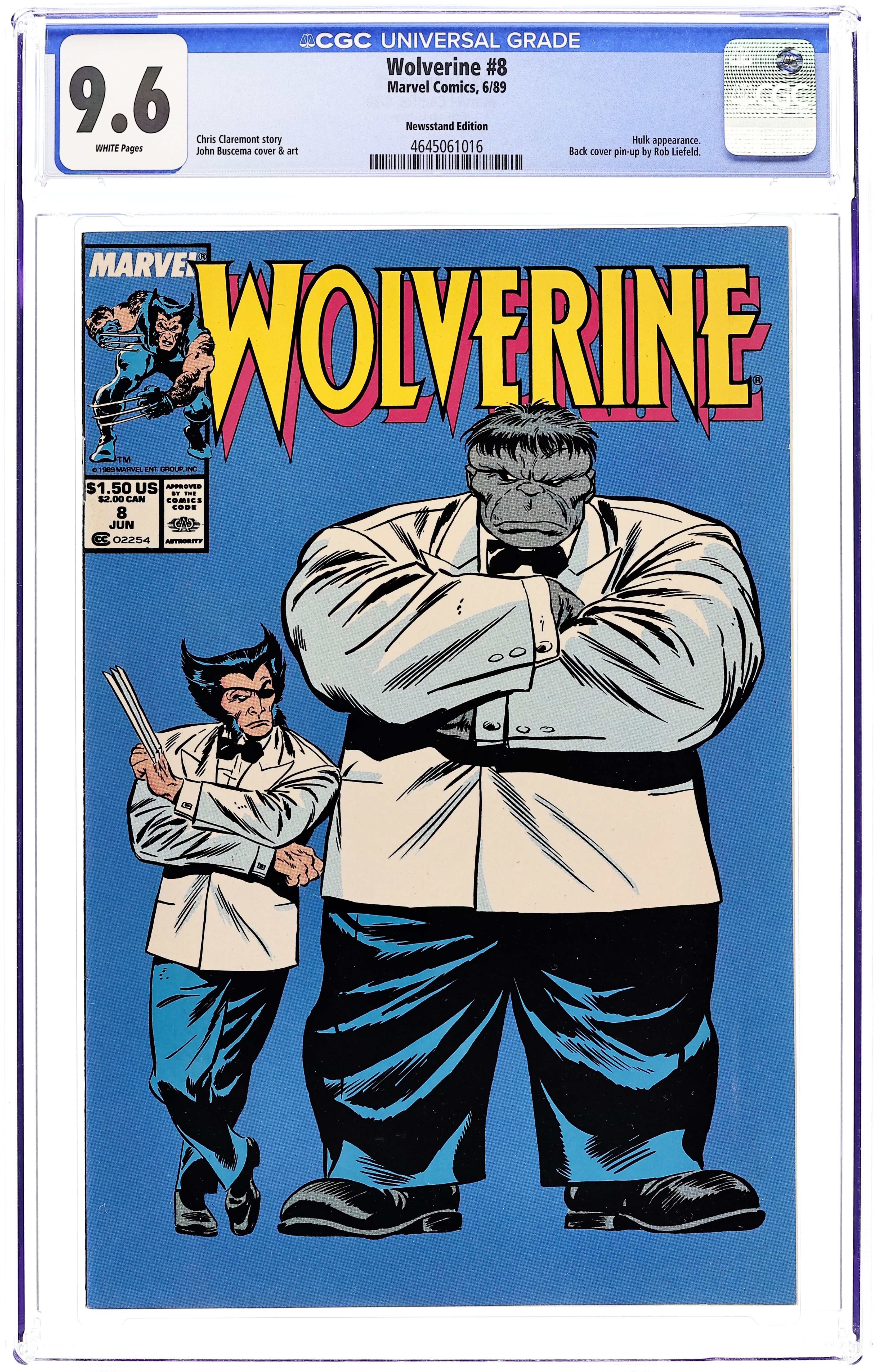 Newsstand Edition. Part 2 of 2 - "If It Ain't Broke...!" Guest-starring the Incredible Hulk. Written by Chris Claremont. Art by John Buscema . In a humorous turn of events, using the Hulk's brute strength to do his dirty work for him, Wolverine tricks the Grey Goliath into trashing Coy's slave ring and cocaine operation. Rob Liefeld art on back cover. Cover price $1.50.