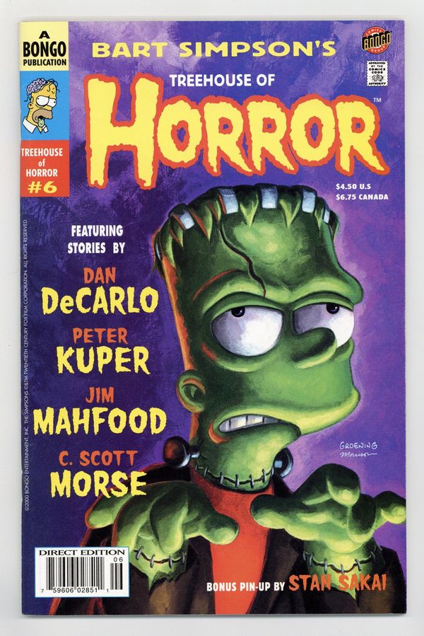 $21.00by Various It's time again for Treehouse Terror! Prepare yourself to be scared silly by the monstrous talents of the comic industry, both young and old! Jim Mahfood (Grrl Scouts, Zombie Boy, Clerks) guides Ned Flanders through the pits of Hell, when Rod and Todd are possessed by demons, turning Springfield upside down! C. Scott Morse (Soulwind, Visitations, Volcanic Revolver) paints the town red with a tale of a beast, a bar, and the redemptive power of beer. Peter Kuper (Eye of the Beholder, The System, MAD's Spy Vs. Spy) goes ?Kafka' on Homer Simpson, when he metamorphisizes him into a cockroach! And finally, Veteran Archie artist and pin-up pioneer Dan DeCarlo, and Bongo's own Bill Morrison, take ?weird' science into their own hands, play God, and create a modern Prometheus in a story of adolescence, acne, and re-animation, called "Young Frinkenstein!" Scream with delight as Bongo dishes out a helpful heaping of Halloween horror! Printed on recycled paper with post-consumer waste. FC, 64pg. Direct Edition cover has issue #6, Newsstand Edition has Annual 2000 Cover price $4.50.