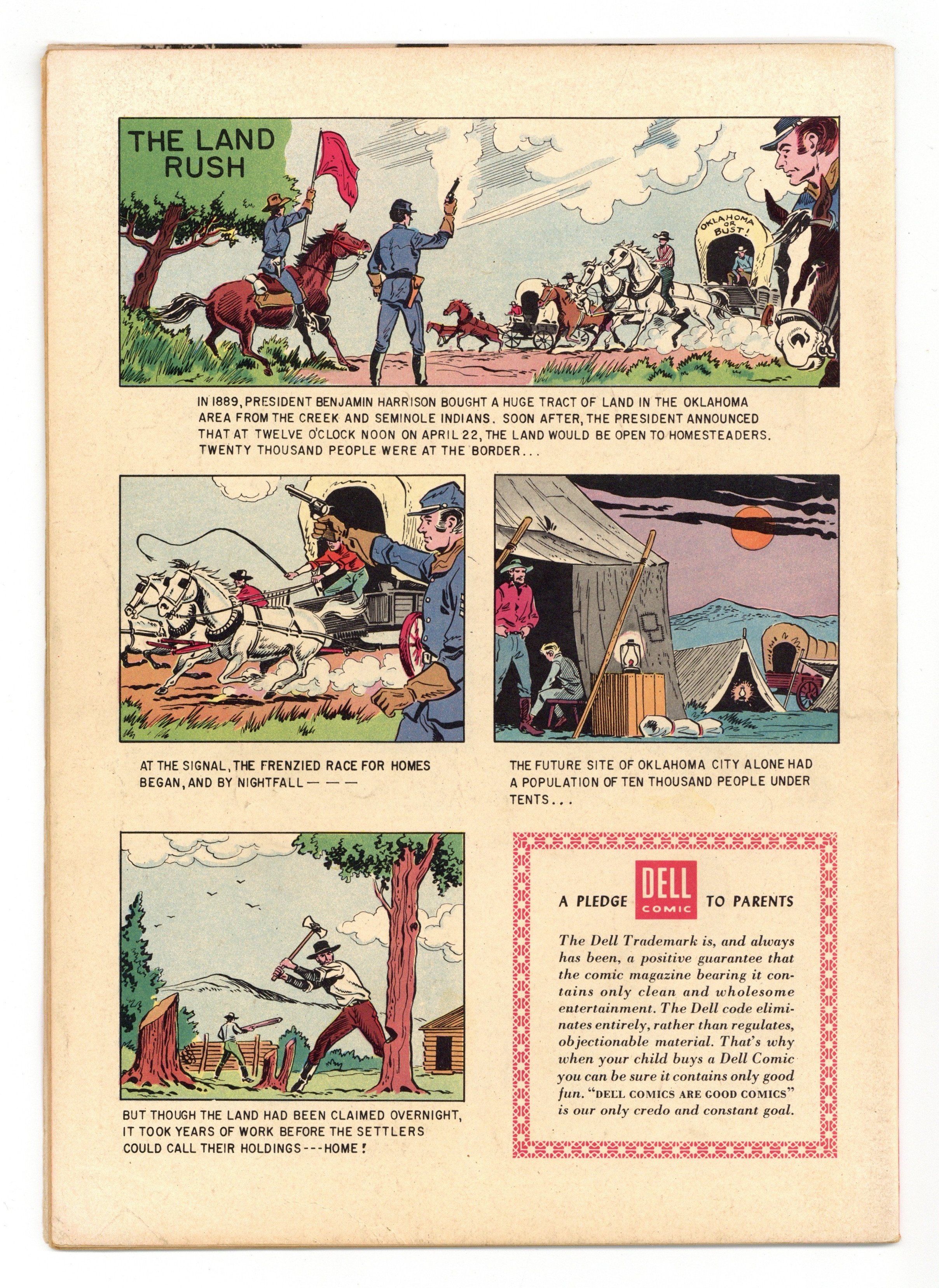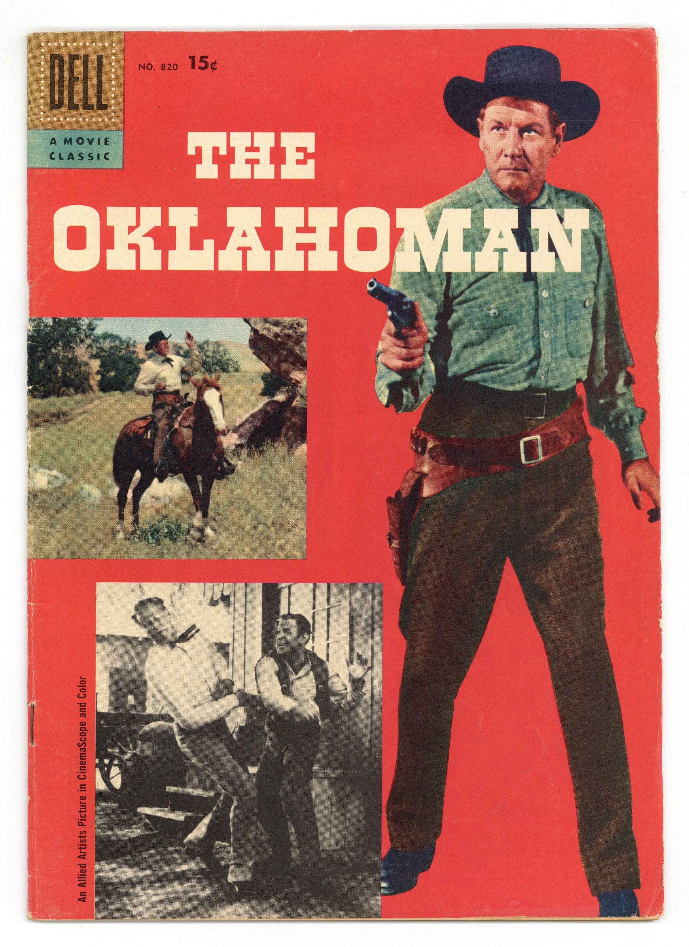 $81.0015ยข Edition. Indicia title is "THE OKLAHOMAN, No. 820." Photo cover of Dr. John Brighton (as played by Joel McCrea) and Cass Dobie (as played by Brad Dexter). Intro with seven photos from the movie plus partial cast list. The Oklahoman, script by Daniel B. Ullman (movie screenplay) and Paul S. Newman (comic adaptation), art by Bob Jenney; Dr. John Brighton settles in Cherokee Wells after his wife dies giving birth to his daughter; Five years later, big cattleman Cass Dobie is trying to run off the smaller ranchers and makes an enemy of the Doctor. Cass Dobie suspects there is oil on Indian Charlie Smith's property; He sends his brother Mel to take a sample for analysis, but Smith sees him and Mel tries to shoot him. Based on the 1957 movie "The Oklahoman." The First Oil Well, art by Bob Jenney; the drilling of the first oil well by Edwin Drake in Pennsylvania in 1895. The Land Rush, art by Bob Jenney; A description of the land rush in Oklahoma in 1889. 36 pages, full color. Cover price $0.10.