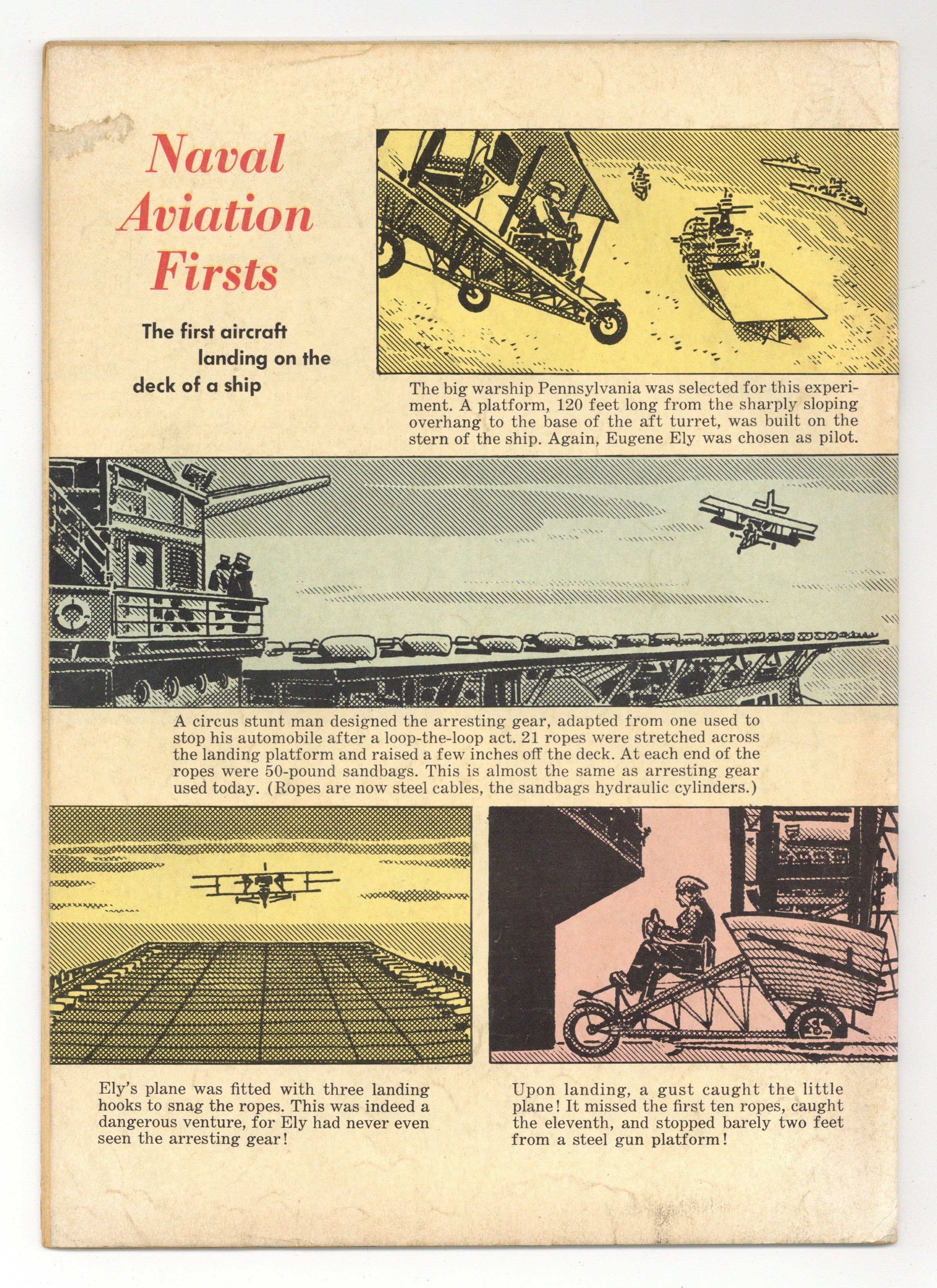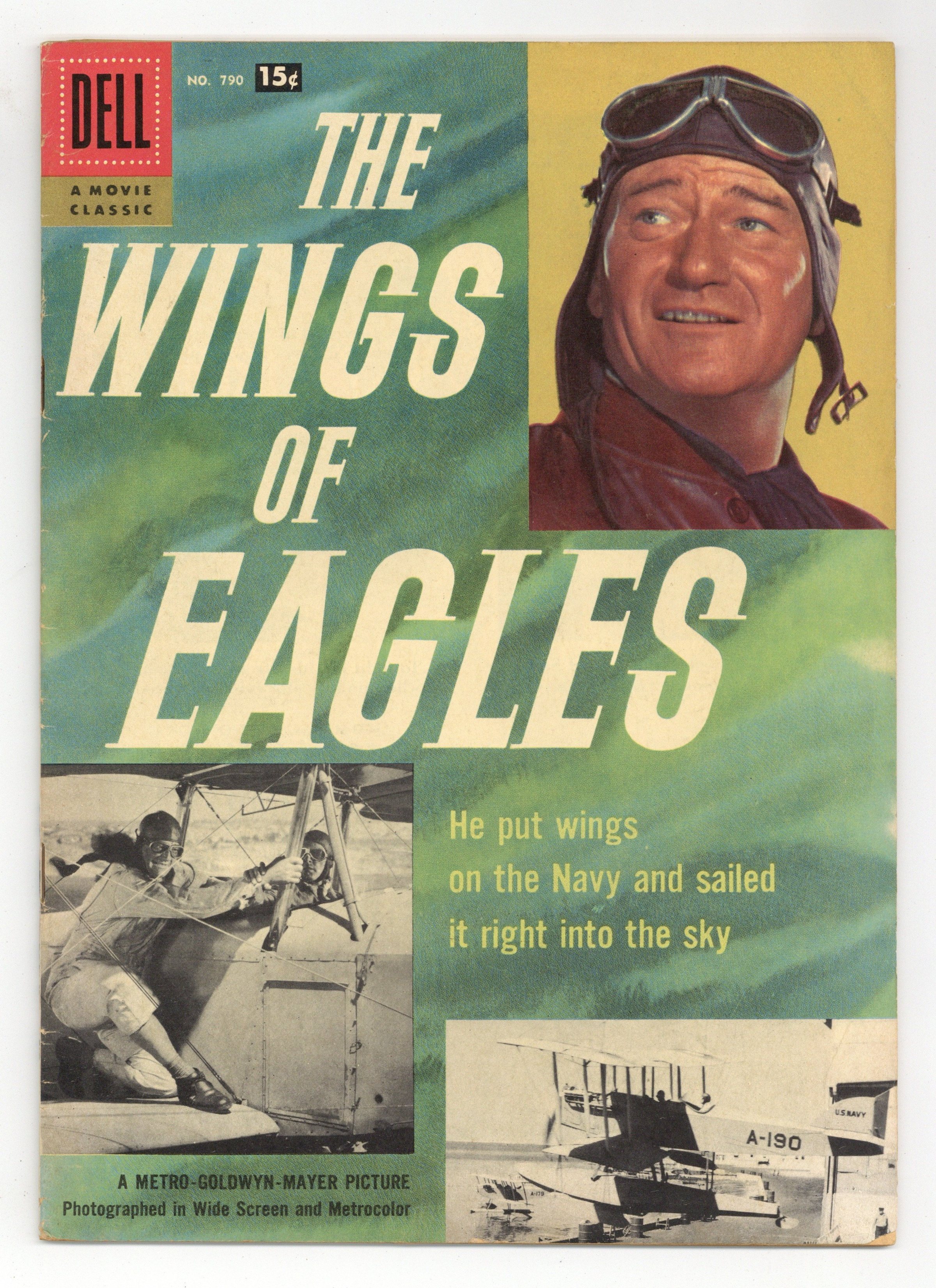 $165.0015ยข Edition. Indicia title is "THE WINGS OF EAGLES, No. 790." Photo cover of Frank "Spig" Wead (as played by John Wayne). Preview of the story with four photos and partial cast list. The Wings of Eagles, pencils by Alex Toth; The life story of Frank "Spig" Wead, a pioneer in Naval aviation, who, after an accident grounded him, became a screenwriter in Hollywood; During World War II, Wead rejoined the Navy and designed a supply link to provide reserve aircraft to large carriers during battles. Adapted from the 1957 M-G-M movie "The Wings of Eagles." The character John Dodge is a fictionalized version of movie director John Ford. Description of the first aircraft to take-off from the deck of a ship--in 1910. Description of the first landing of an aircraft on a ship. 36 pages, full color. Cover price $0.15.