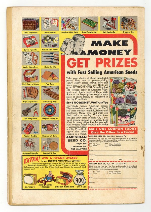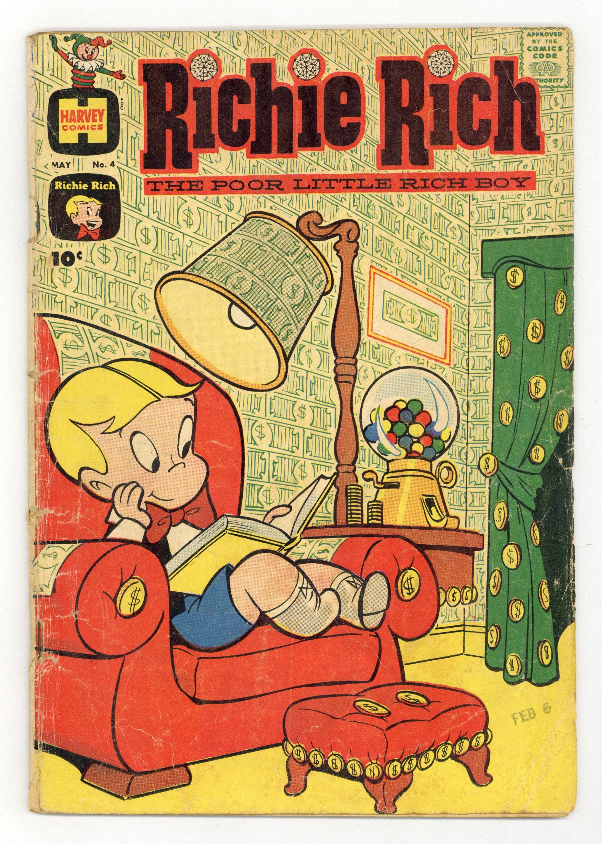Untitled one-page story; Richie goes to the moon to get an autograph. "His Wonderful Wallet"; Richie's father gives him a wallet that can hold objects that are many times its own size; When he begins to show it to Gloria, she lectures him on the vulgarity of displaying wealth and tells him to put his wallet away; Richie complies but then surprises her by producing an umbrella, a chair, sandwiches, a radio and then a bicycle seemingly from nowhere. Untitled one-page story; Lotta plows a field. "Quicker Than The Eye"; Richie out pranks Reggie. "Dot's The Limit"; Dot has nightmares. "The Bigger Boob" text story. "Going Home" text story. "Not Wanted"; Lotta helps capture some crooks. 36 pgs., full color. Cover price $0.10.