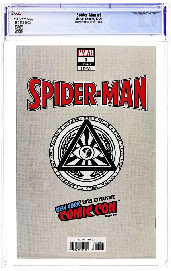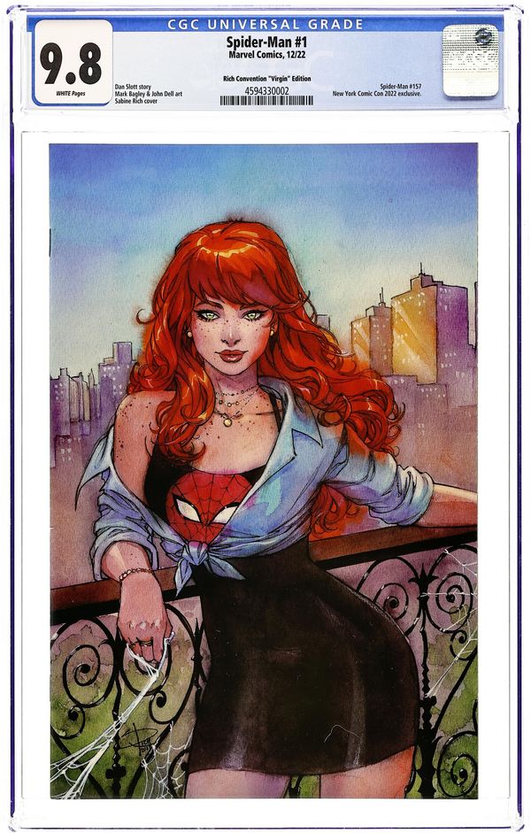 2022 New York Comic Con and Comics Illuminati (Unknown Comics, Street Level Hero, Comic Traders, Anti-Hero Gallery, and The 616 Comics) exclusive virgin Cover by Sabine Rich. Written by Dan Slott. Art by Mark Bagley. "The End of the Spider-Verse" is here! Morlun is back and he is not alone. Allied with one of the most powerful beings known to the Spider-Verse, the scariest Spider-Villain of all time is making his biggest play and no Spider is safe. Especially not the Chosen Spider himself, Peter Parker. With Peter working for Norman Osborn and using a glider…does he have it coming? Spidey's 60th Anniversary is no joke as two of the most legendary Spider-Creators are working together on Spidey for the first time and you know it's going to be one for the record books! 40 pages, full color. Rated T