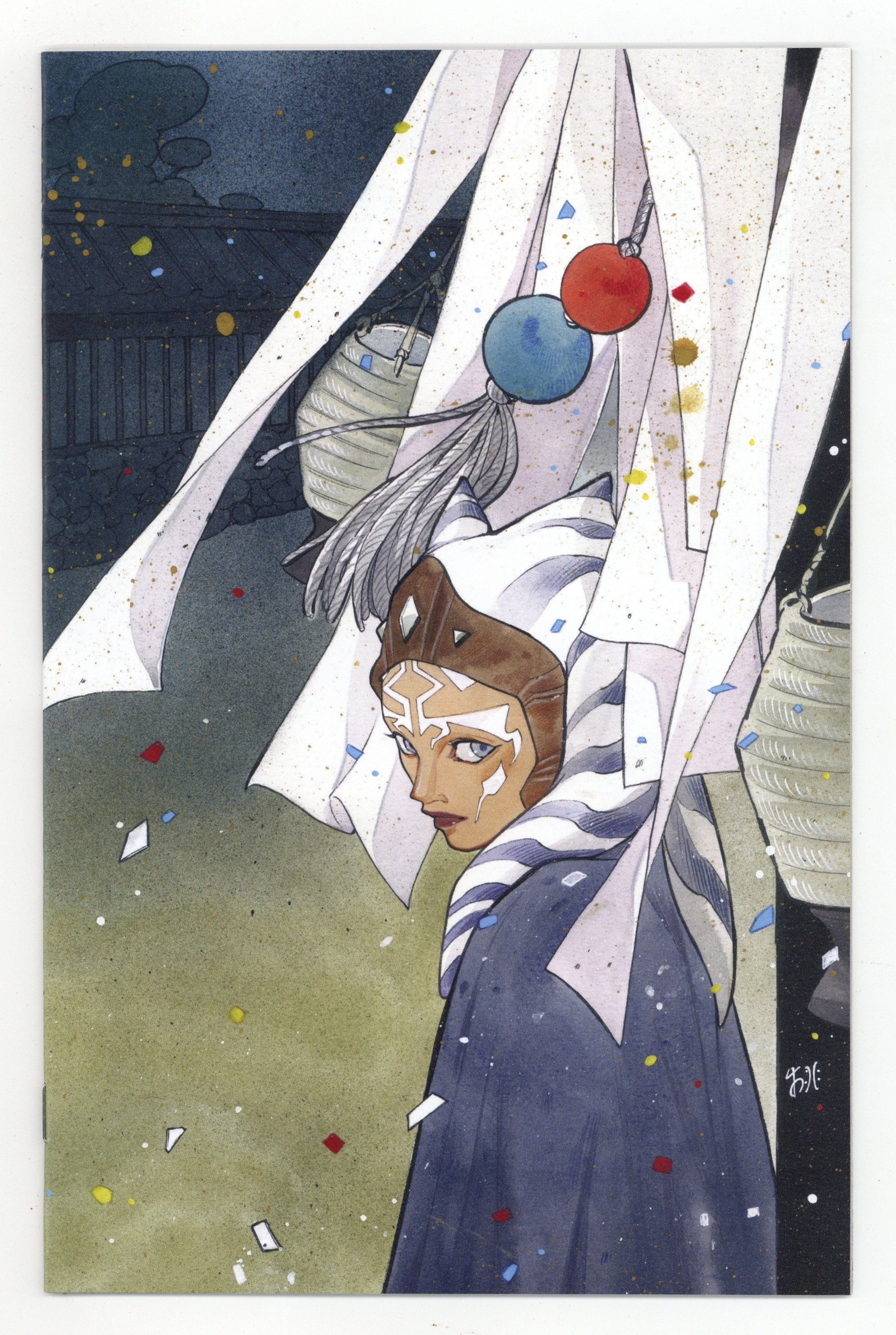 Comics Illuminati (The 616 Comics, Unknown Comics, Comic Traders, and Anti-Hero Gallery) exclusive Virgin Cover by Peach Momoko. Written by Rodney Barnes. Art by Georges Jeanty. THE JEDI! THE MANDALORIAN journeys to a world ruled by a cruel magistrate who has made a powerful enemy. Featuring JEDI MASTER AHSOKA! 36 pages, full color. Rated T