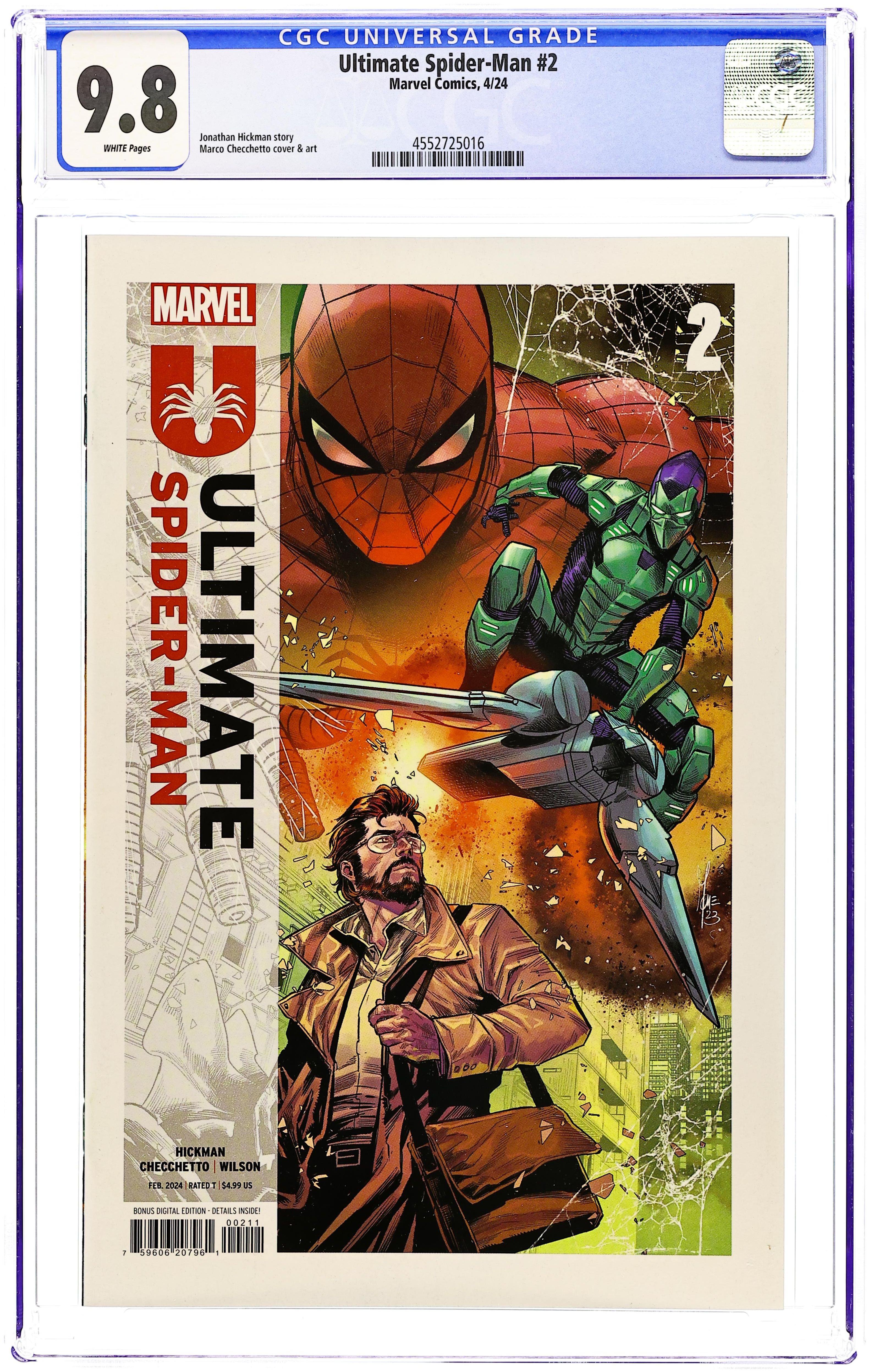 Written by Jonathan Hickman. Art by Marco Checchetto. Cover by Marco Checchetto. THE MOST SURPRISING SPIDER-MAN STORY OF THE 21ST CENTURY CONTINUES! Spider-Man faces his first super villain! J. Jonah Jameson's quest to uncover who is really pulling the strings of this new Ultimate Universe leads to a shocking revelation! And New York City welcomes its newest hero…the Green Goblin! 32 pages, full color. Rated T Cover price $4.99.