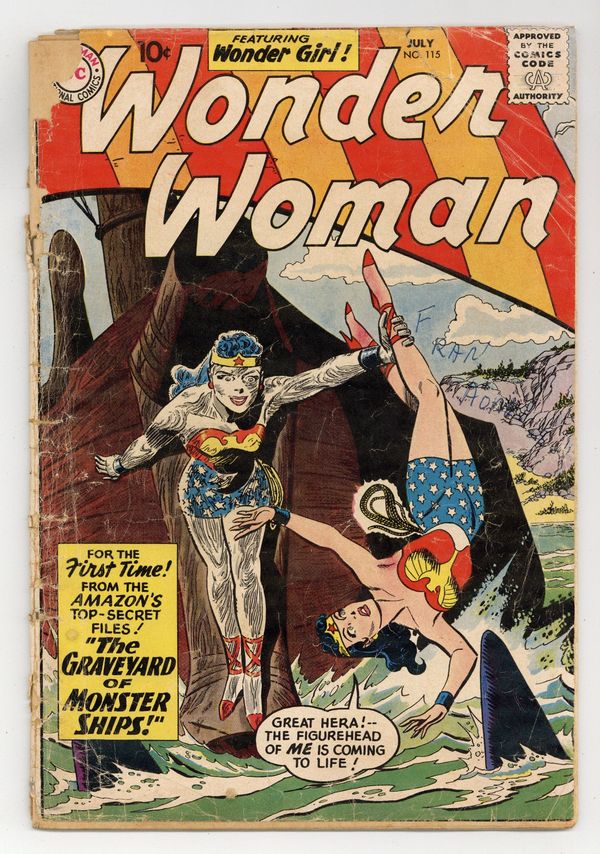 Starts Dec 8 Cover pencils by Ross Andru, inks by Mike Esposito. "Graveyard of Monster Ships!", script by Robert Kanigher, pencils by Ross Andru, inks by Mike Esposito; Wonder Woman and Steve Trevor investigate a graveyard of shipwrecks; Angle Man uses his new weapon, Animox, to animate the figureheads on all the ships to attack Wonder Woman. "Mer-Boy's Undersea Party!", script by Robert Kanigher, pencils by Ross Andru, inks by Mike Esposito; Mer-boy wants Wonder Girl to go to an undersea party with him. 36 pages, Full Color. Cover price $0.10.
