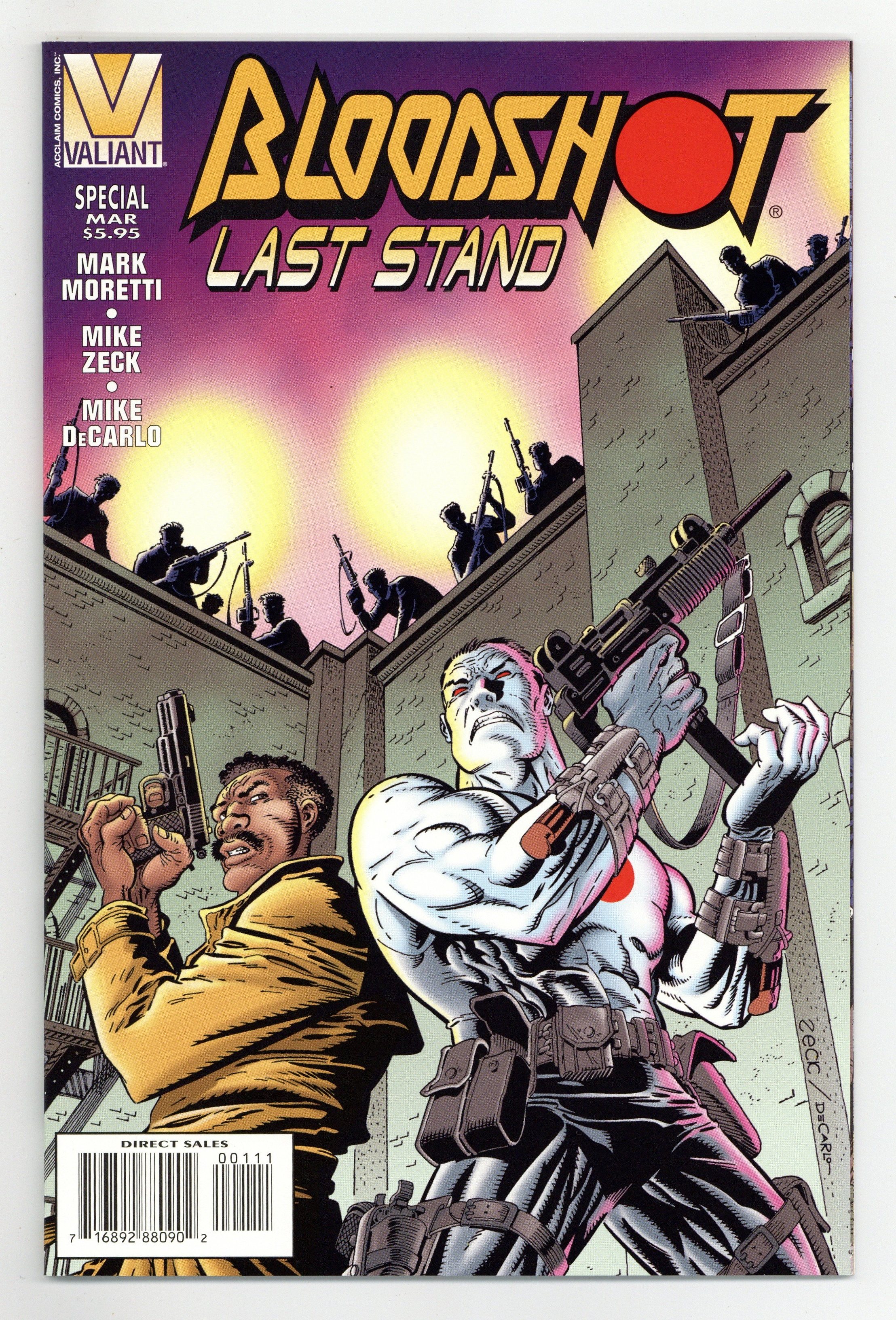 $16.00This special graphic novel by superstar Mike Zeck and veteran Bloodshot writer Mark Moretti pits Bloodshot against his most dangerous nemesis -- his father! Bloodshot intervenes when he discovers that his father is wanted by the FBI. Bloodshot's effort to track down his father reveals more than the nanite-enhanced hero may want to know about his past, and ends in a climactic battle between father and son that Bloodshot fans won't want to miss! Written by Mark Moretti, with art and cover by Mike Zeck and Mike DeCarlo. Cover price $5.95.