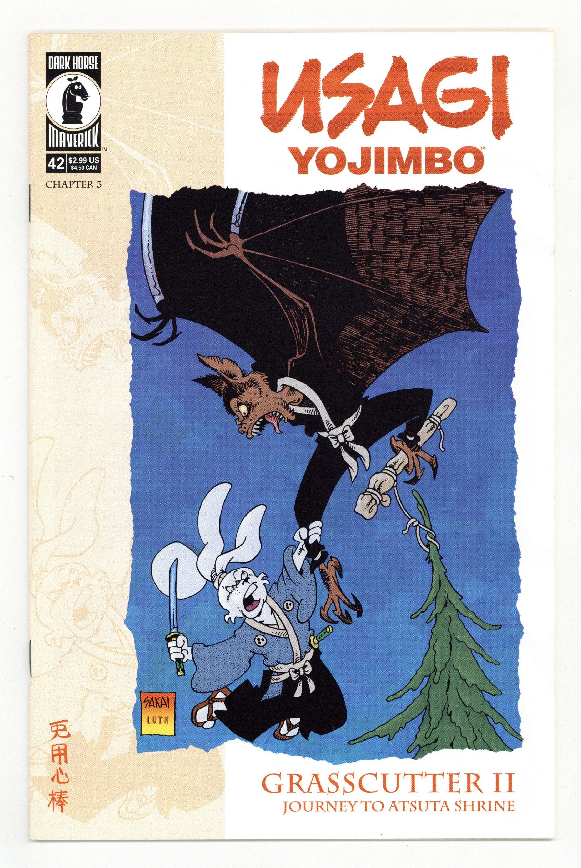 Published Oct 2000 by Dark Horse.$12.75Grasscutter II: Journey to Atsuta Shrine Part 4 of 7 - Story and art by Stan Sakai. Usagi and his friends, Gen and Sanshobo, continue their journey to Atsuta Shrine to deliver Grasscutter, the sword of the gods, when they are ambushed by the Neko Ninja clan. During the battle, the Komori bat ninja clan swoops in and steals the blade. Usagi and Chizu, the leader of the Neko, must now form an uneasy alliance to retrieve the sword, as an assassin stalks Chizu! Acclaimed creator Stan Sakai continues his epic sequel to last year's Eisner Award-winning Grasscutter. 32 pages, B&W. Cover price $2.99.