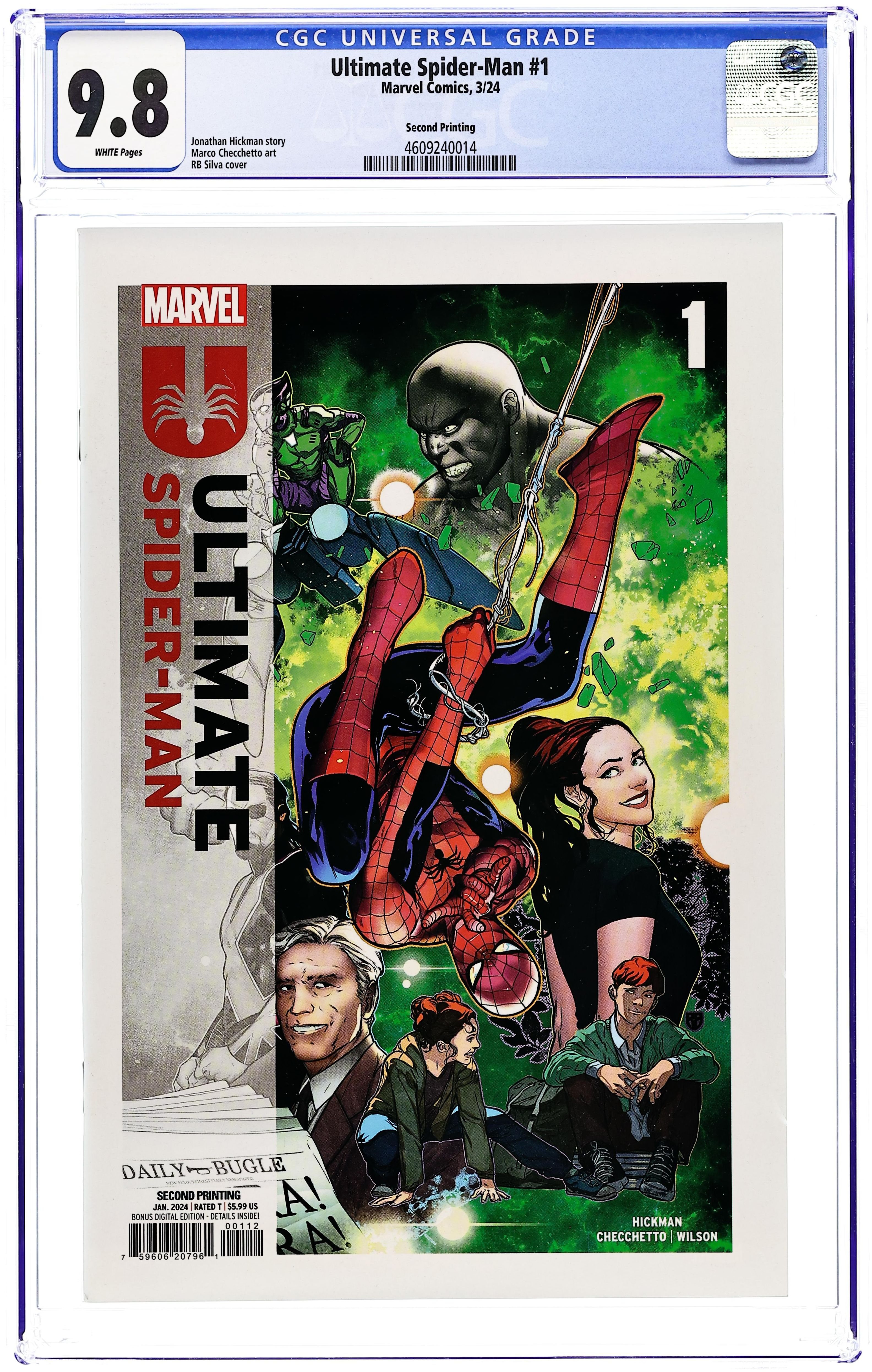 2nd Printing. Written by Jonathan Hickman. Art by Marco Checchetto. Cover by R. B. Silva. THE NEW ULTIMATE SPIDER-MAN FOR A NEW ULTIMATE UNIVERSE!Visionary writer Jonathan Hickman (HOUSE OF X/POWERS OF X) and acclaimed artist Marco Checchetto (DAREDEVIL) bring you a bold new take on Spider-Man, with this, the debut title of the new line of Ultimate Comics! After the events of ULTIMATE INVASION, the world needs a hero...who will rise up to take on that responsibility? Prepare to be entangled in a web of mystery and excitement as the all-new ULTIMATE SPIDER-MAN comic redefines the wall-crawler for the 21st Century! 48 pages, full color. Rated T Cover price $5.99.
