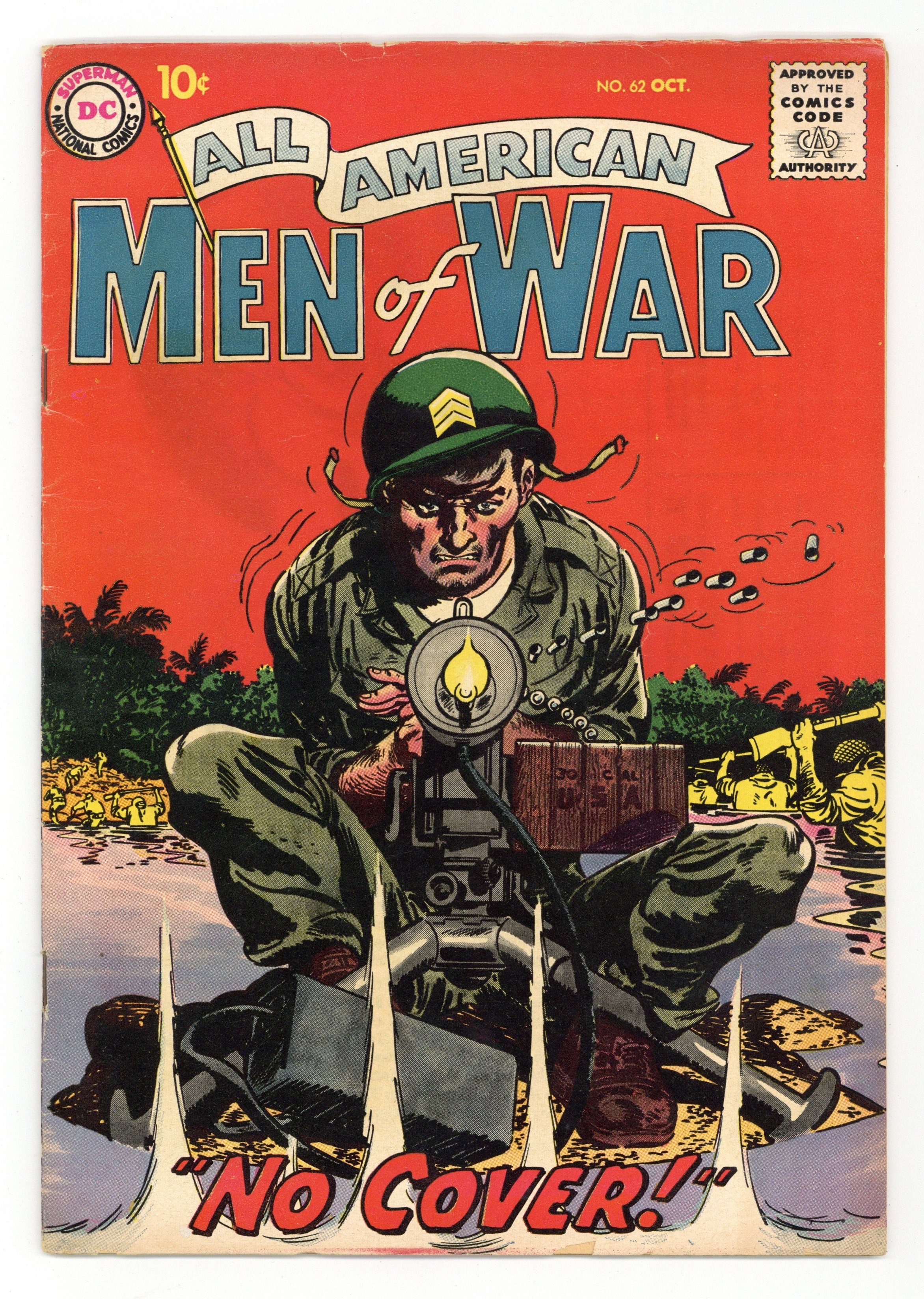 Edited by Whitney Ellsworth. Cover by Jerry Grandenetti. Stories by Robert Kanigher, Ross Andru, Mike Esposito, Morris Waldinger, Tom Nicolisi, Bob Haney, Jerry Grandenetti, Bob Stuart, Morris Waldinger, Tom Nicolisi, Bob Haney, and Russ Heath. Adventure tales of war and the military, including some humor—go into combat with All American Men of War! 36 Pages, Full Color. Cover price $0.10.
