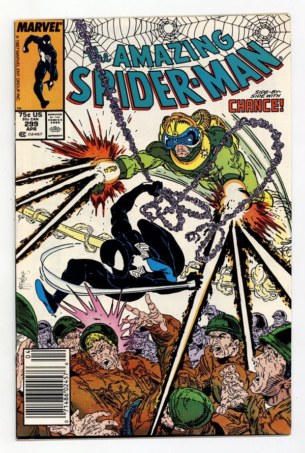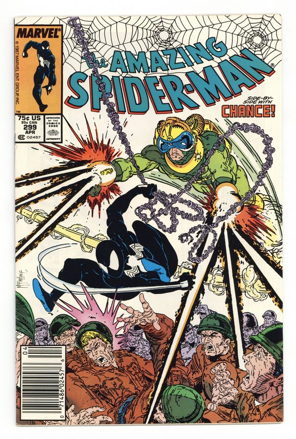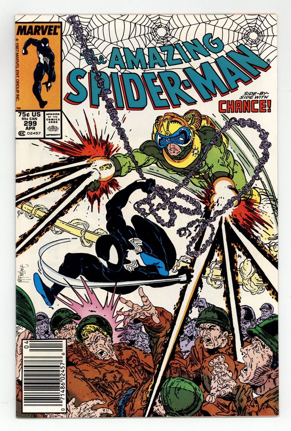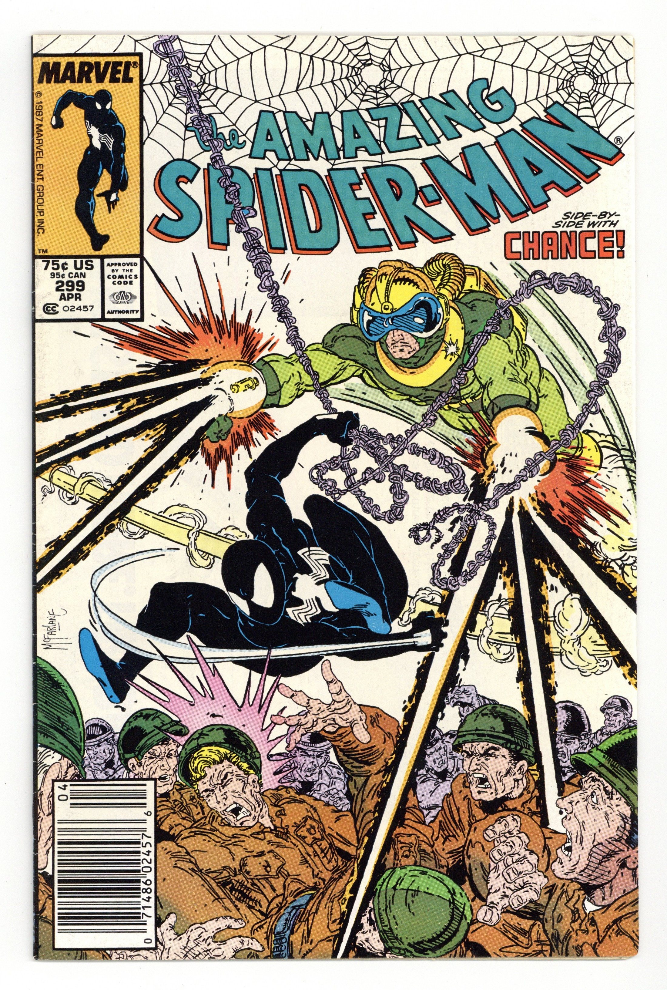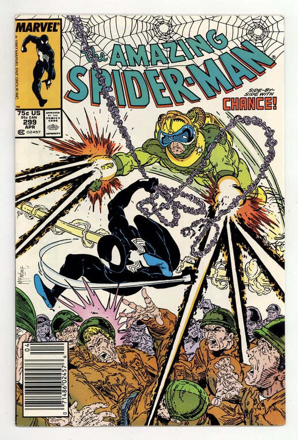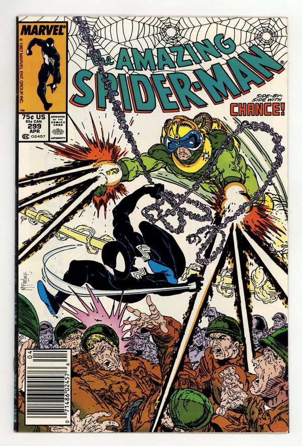 Newsstand Edition. "Survival of the Hittist!" Part 2 of 2. Script by David Michelinie. Pencils by Todd McFarlane. Inks by Bob McLeod. Cover by Todd McFarlane. After their waterfront arms theft goes awry, the Life Foundation turns the tables on Chance! The mysterious survivalist group abducts the mercenary and takes him to their secret headquarters in northern New Jersey! But thanks to a well-placed spider tracer, the web-slinger infiltrates the foundation's secluded colony the next day...and rescues Chance! So now the adversaries of 24 hours ago suddenly become allies to avoid death...courtesy of the Life Foundation! First appearance (and cameo on the last page) by Venom. Cameo appearances by Eddie Murphy, Paul Schaffer, and Joe Robertson. Last 75¢ issue. 36 pages, full color. (Note: Chance returns in Amazing Spider-Man 336.) Cover price $0.75.